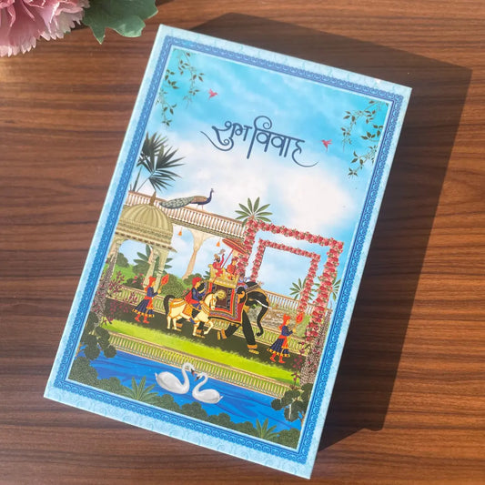 Shubh Vivah Blue Wedding Coin Box, UV Printed, Square Shape, Set of 5 Coins (10 Gram Each), 999 Purity Silver Coin – Ready to Ship