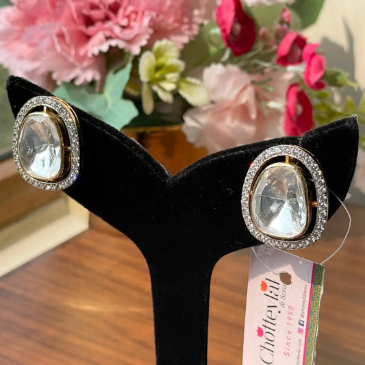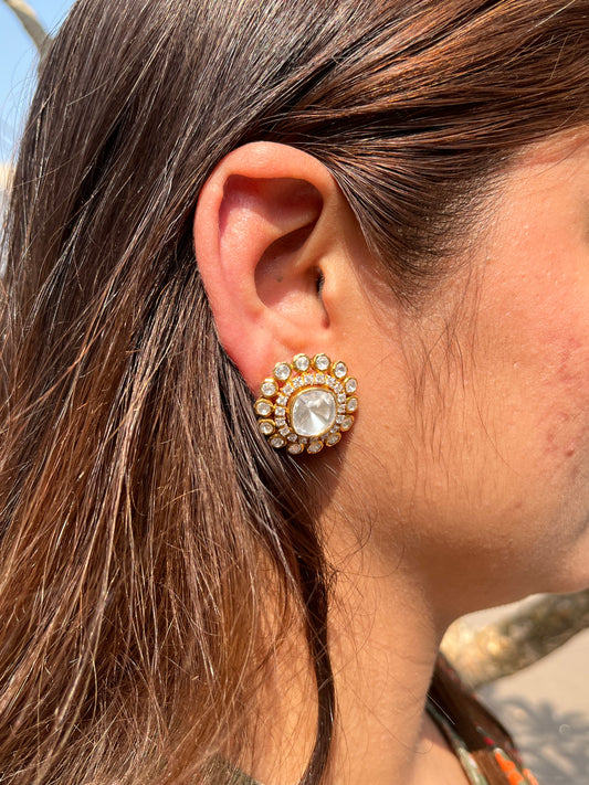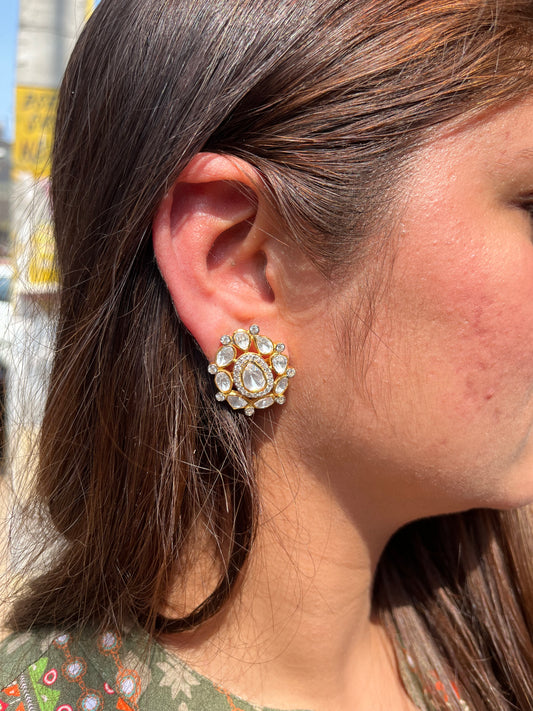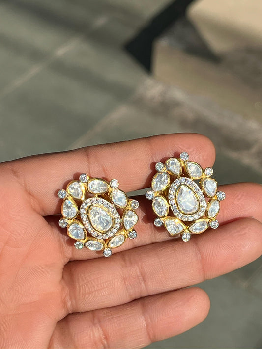Regal Gold Polki Stud Earrings- 22K Gold Plated, 92.5 Pure Silver Base