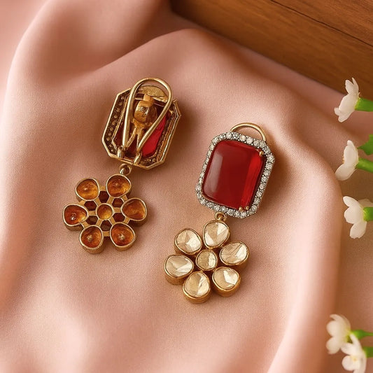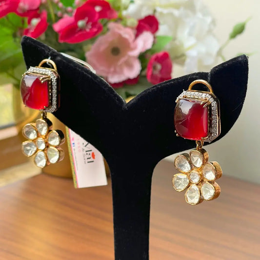 Ruby Square & Floral Drop Polki Earrings - 22K Gold Plated, 92.5 Pure Silver Base