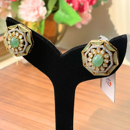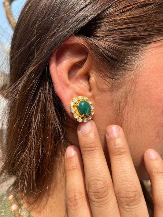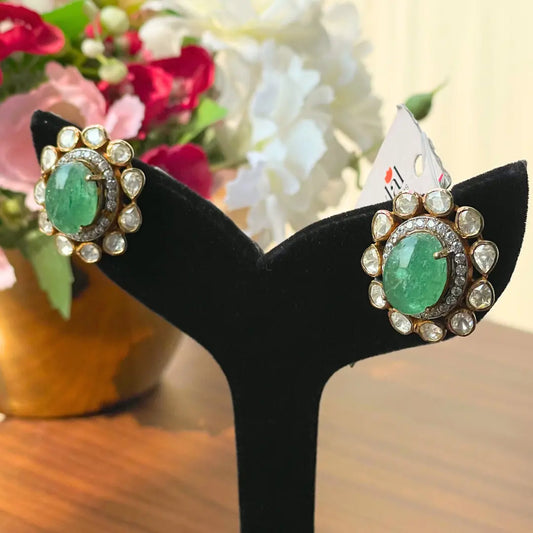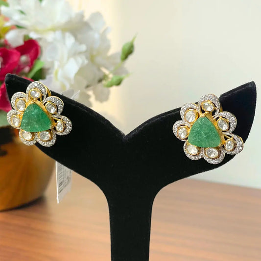 Emerald Polki Stud Earrings - 22K Gold Plated, 92.5 Pure Silver Base