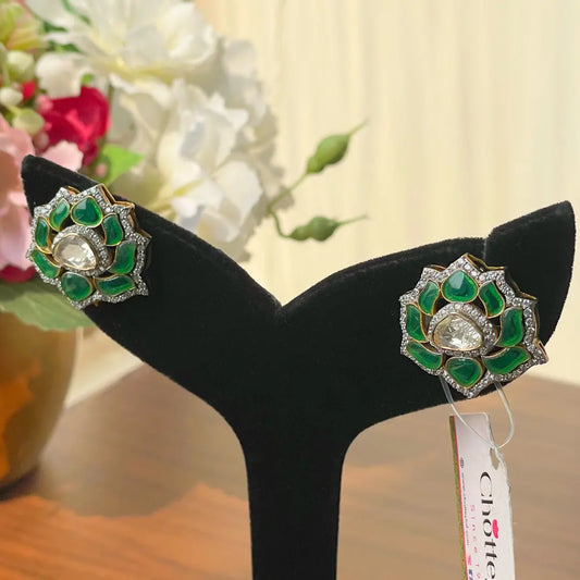 Green Lotus Polki Earrings - 22K Gold Plated, 92.5 Pure Silver Base