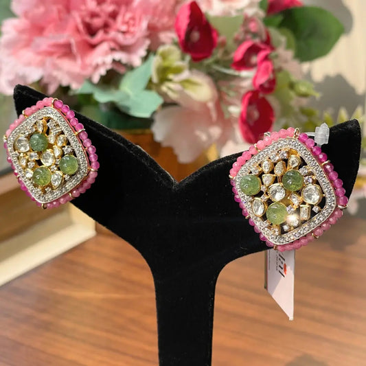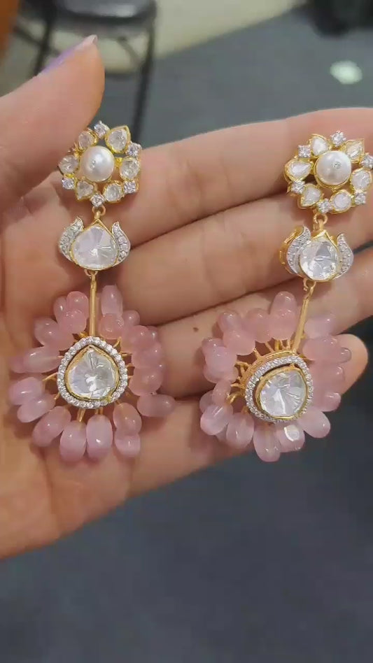Monalisa Pink Quartz Polki Earrings - 22K Gold Plated, 92.5 Pure Silver Base