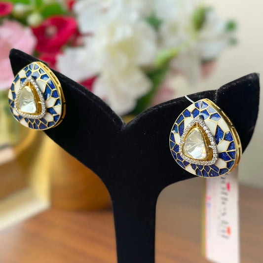 Blue Onyx Polki Earrings - 22K Gold Plated, 92.5 Pure Silver Base