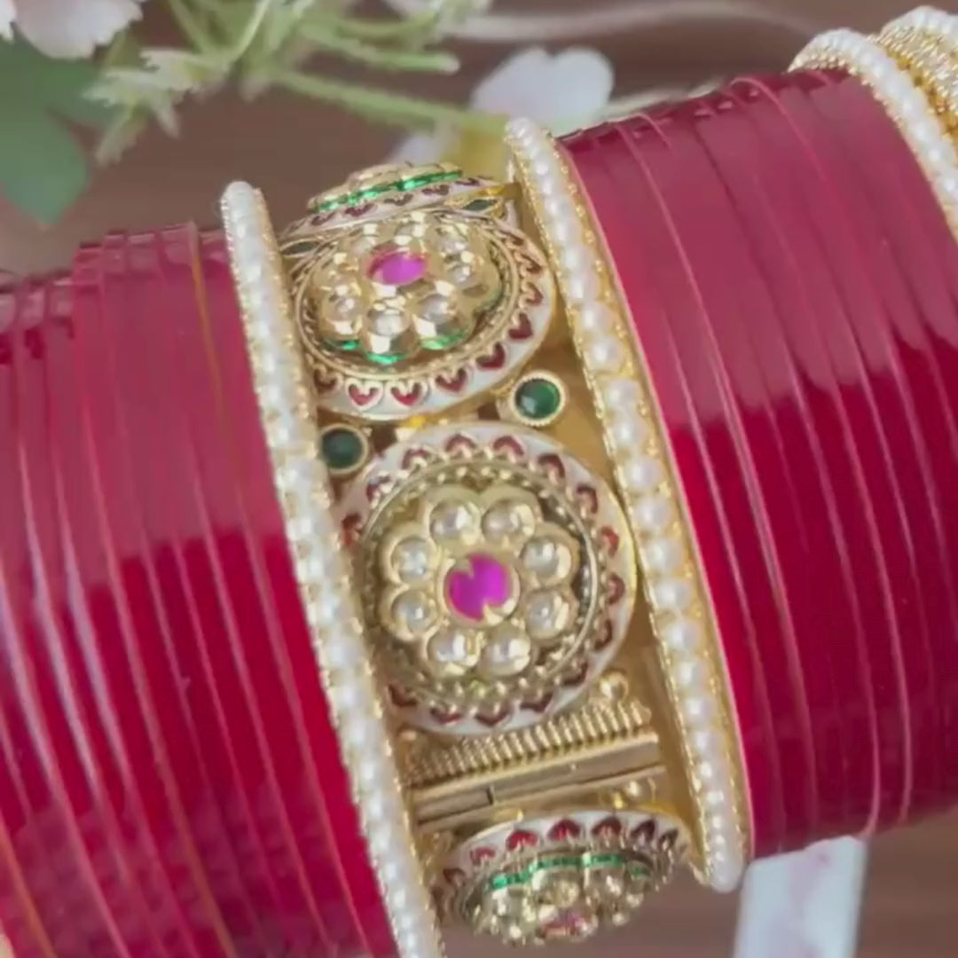 Our Maroon Semi Pearl Chooda sets are designed with auspicious Shagun numbers such as 11, 15, 21, 25, 31, and more. The combination of semi pearl, pearl, and golden diamond bangles ensures these lucky numbers while adding an extra sparkle to your bridal look.