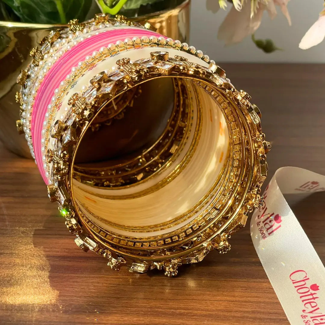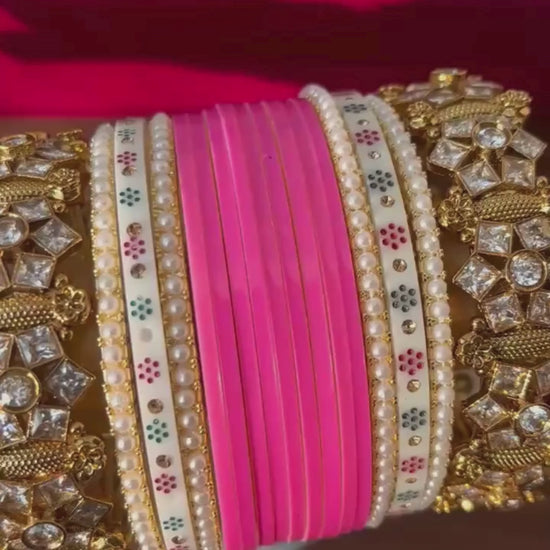 Our Pink Semi Pearl Chooda sets are crafted around auspicious Shagun numbers such as 11, 15, 21, 25, 31, and more. This thoughtful combination of semi pearl, dot, pearl, and kada bangles ensures both aesthetic beauty and a culturally significant set for your wedding celebrations.