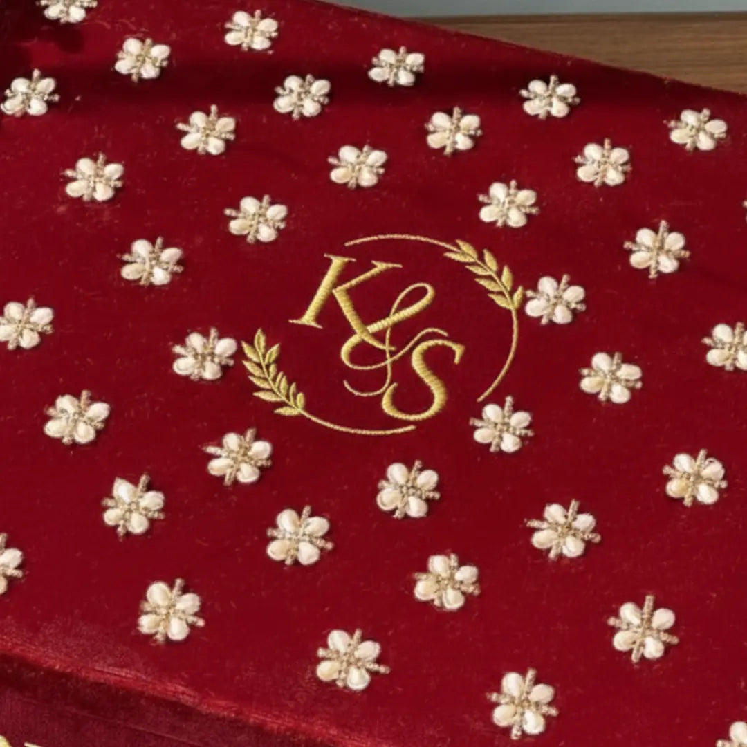Customization is available for our velvet boxes, as they can be beautifully hand-embroidered. You can add personal touches like names, dates, or initials, usually embroidered on the sides of the box. It’s a wonderful way to make your box uniquely yours!