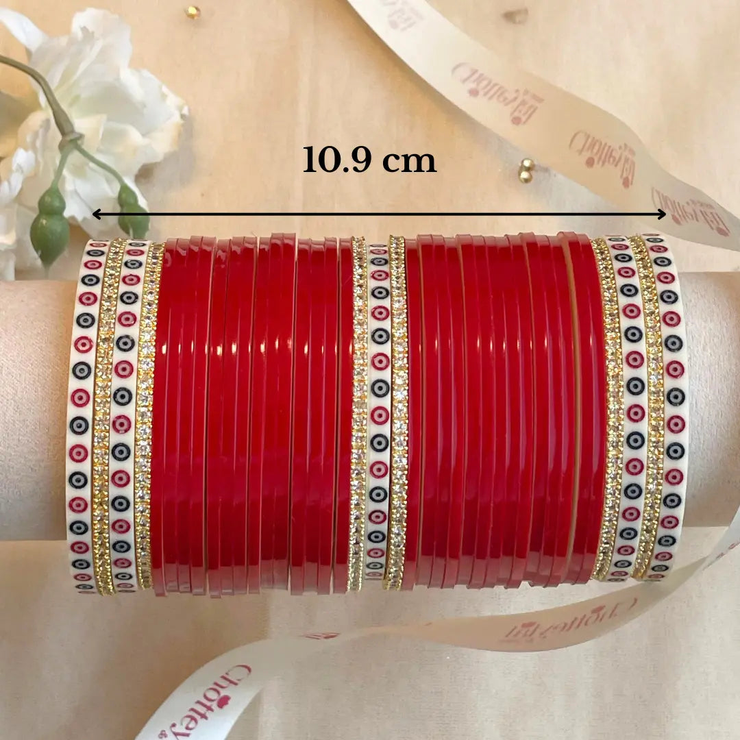 Our Dark Red Chooda sets are thoughtfully designed with auspicious Shagun numbers in mind, such as 11, 15, 21, 25, 31, and more. The combination of red and dot bangles ensures these sacred counts, while additional bangles like shimmer, diamond, and Kundan elevate the elegance and grandeur of your bridal look.