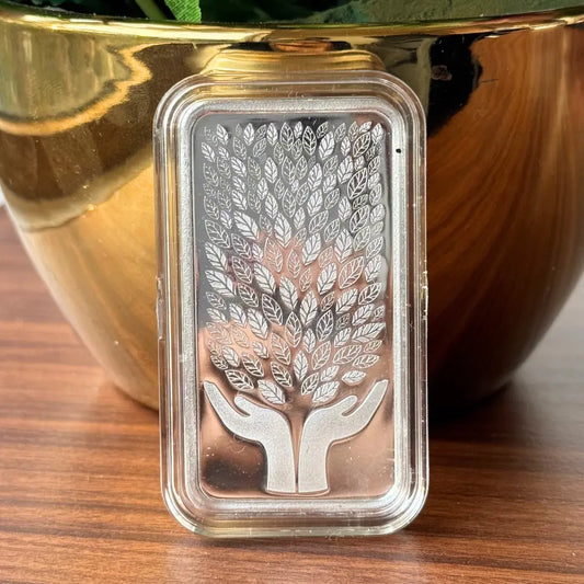 Leaf In Hand, Silver Finish, Bar Shape, Set of 2 (5 Gram Each), 999 Purity Silver Coin - Ready To Ship