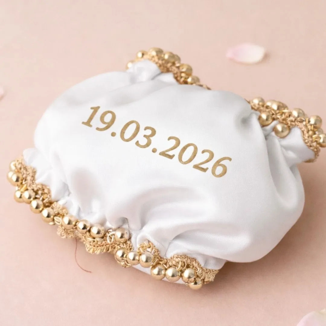 The Customised Wedding White Gaana Cover – Premium Fabric is a sacred pre-wedding ritual accessory designed to adorn and protect the ceremonial Gaana (Kangna Dora). Crafted in a pristine white shade using premium-quality fabric and finished with personalised detailing, this Gaana cover symbolises purity, peace, spiritual harmony, and auspicious beginnings—making it a refined choice for traditional wedding rituals.