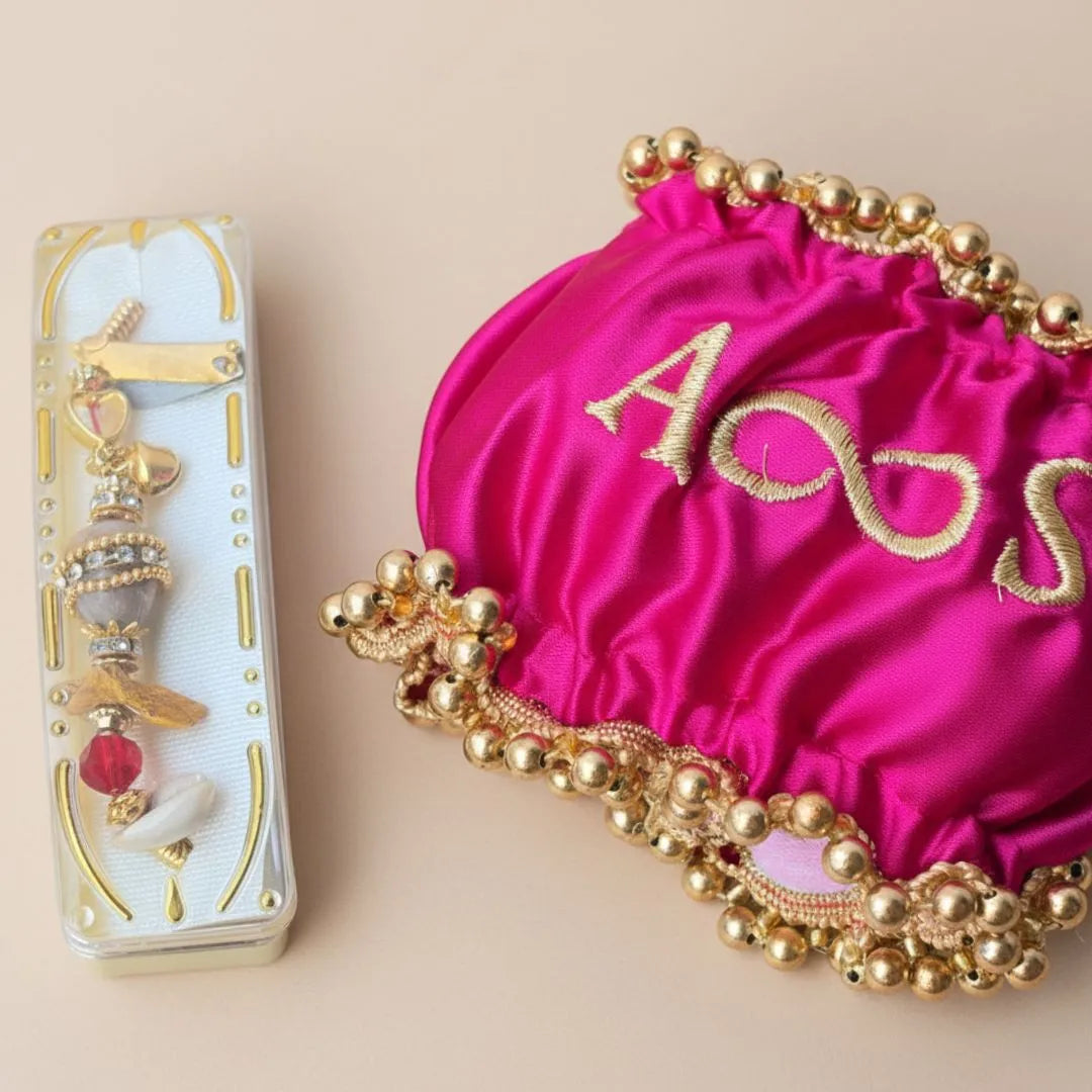 The Gaana (also known as Kangna Dora) with Premium Pink Customised Cover is a sacred pre-wedding ritual essential, symbolising protection, blessings, and the beginning of a new marital journey. Worn by both the bride and groom during wedding ceremonies, the Gaana holds deep cultural and spiritual significance. The decorative cover is thoughtfully designed to complement the ceremonial look of both the bride and the groom, adding elegance, grace, and ceremonial beauty to their wedding rituals.