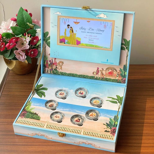 Shubh Vivah Blue Wedding Coin Box, UV Printed, Square Shape, Set of 5 Coins (10 Gram Each), 999 Purity Silver Coin – Ready to Ship