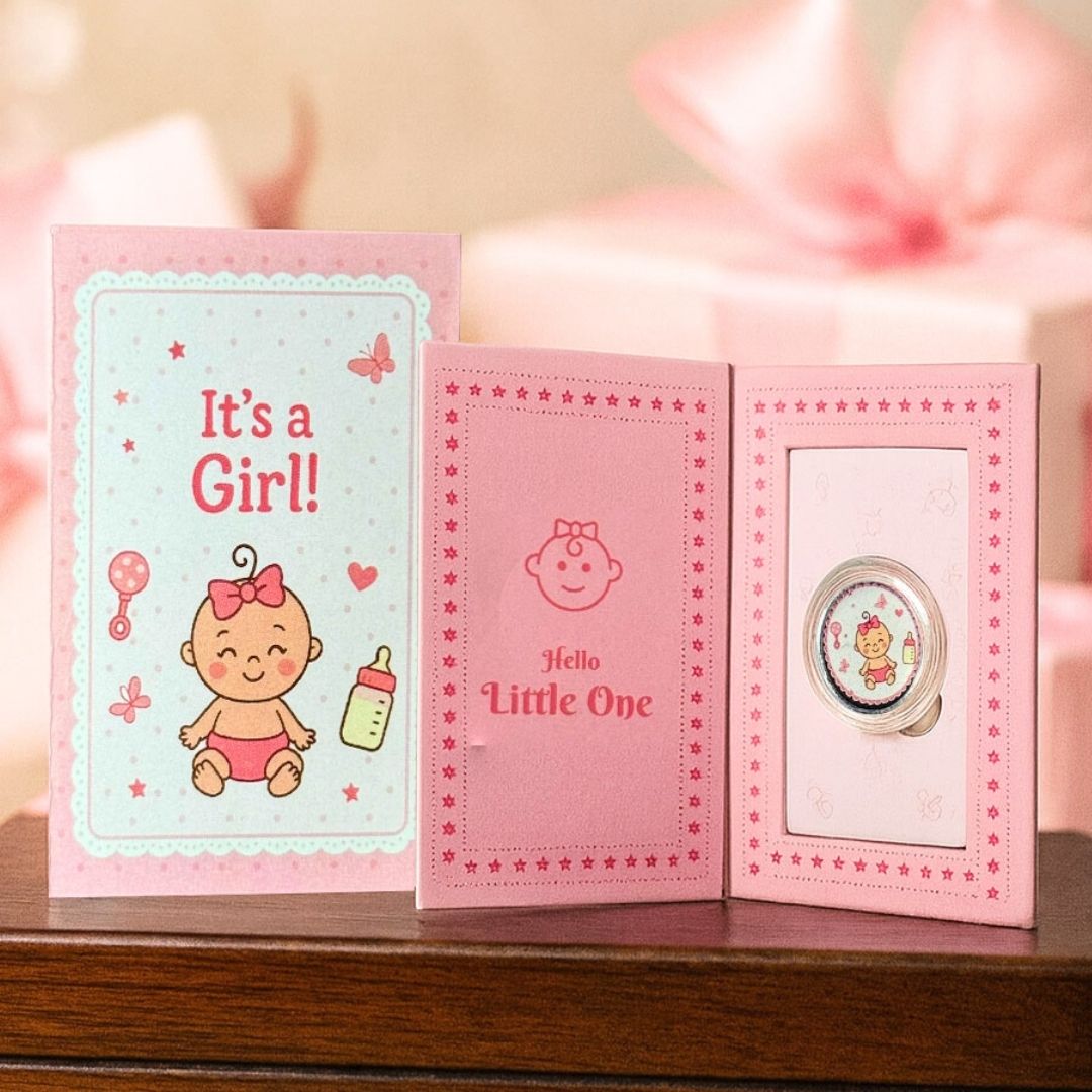 Celebrate the joy of a newborn baby girl with the Blessing 1 GM Girl Baby Silver Coin, beautifully UV printed with an adorable baby girl design. This coin is a perfect gift for baby announcements, birthdays, or first milestones, symbolising love, protection, and prosperity. Since 1950,