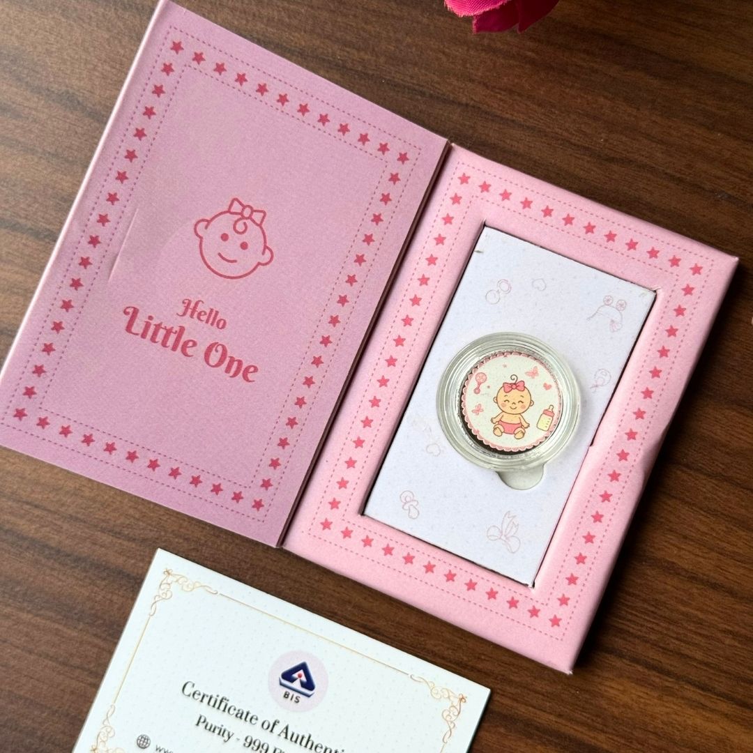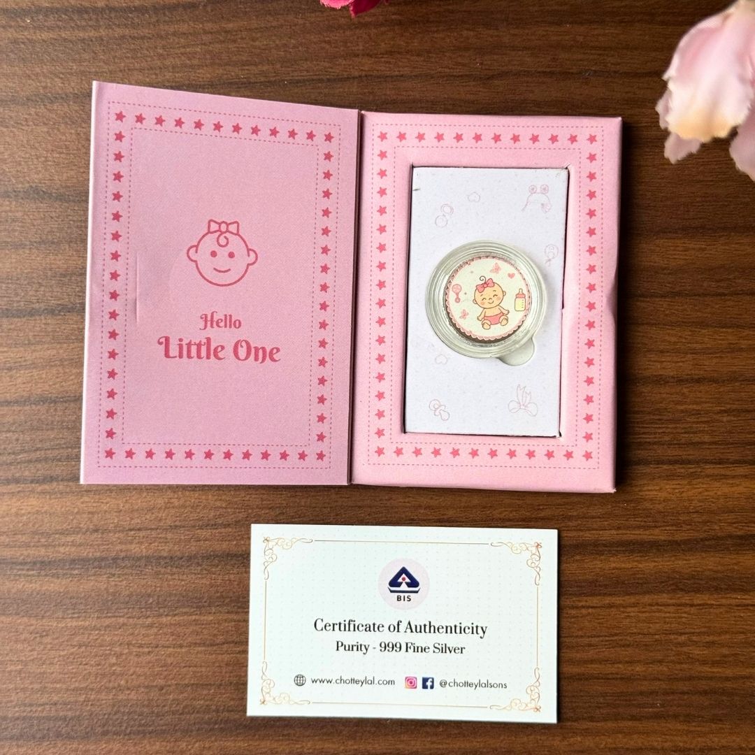 Chotteylal & Sons merges tradition, artistry, and purity to craft silver coins that inspire love and blessings. This coin is a timeless gift for celebrating your baby girl.