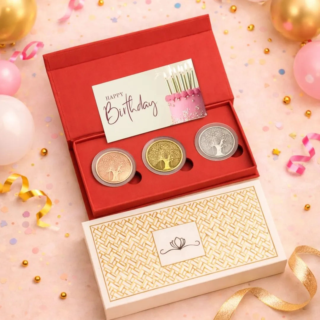 Gift joy, blessings, and prosperity with the Banyan Tree Tri-Color Silver Coin Set, a thoughtfully crafted silver keepsake perfect for weddings, anniversaries, or special occasions. Featuring the banyan tree motif in a charming round shape, this set of 3 coins (3 grams each) is made from 999 purity silver and comes in a white box cover, combining elegance with vibrant tri-color accents. Trusted since 1950, Chotteylal & Sons ensures every coin is a premium-quality gift ready to impress.