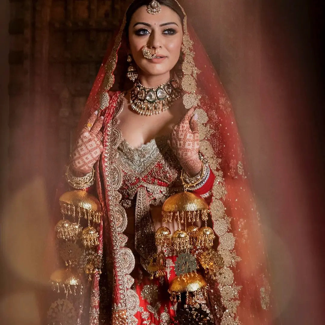 Have you ever imagined wearing a bridal Kalira that perfectly blends tradition with modern elegance, just like Hansika Motwani? If your heart says yes, then you're in the right place! Our Hansika Motwani-Inspired Heart-Shaped Tassel Bridal Kalira is designed to add that unique touch of romance and sophistication to your bridal ensemble. Featuring delicate heart-shaped tassels, peacock motifs, and customizable elements, this Kalira is perfect for brides who want to shine with a look that’s as one-of-a-kind as their love story.