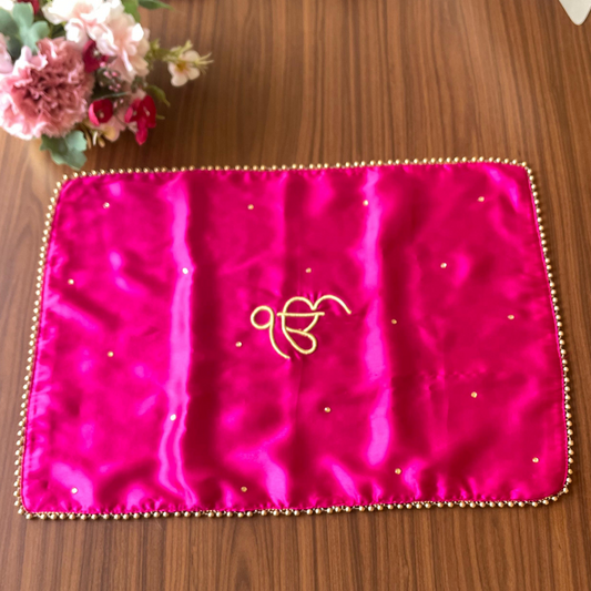Pink Rectangular Placement Mats With Golden Bead Border - Customize Om/Ek Onkar Logo