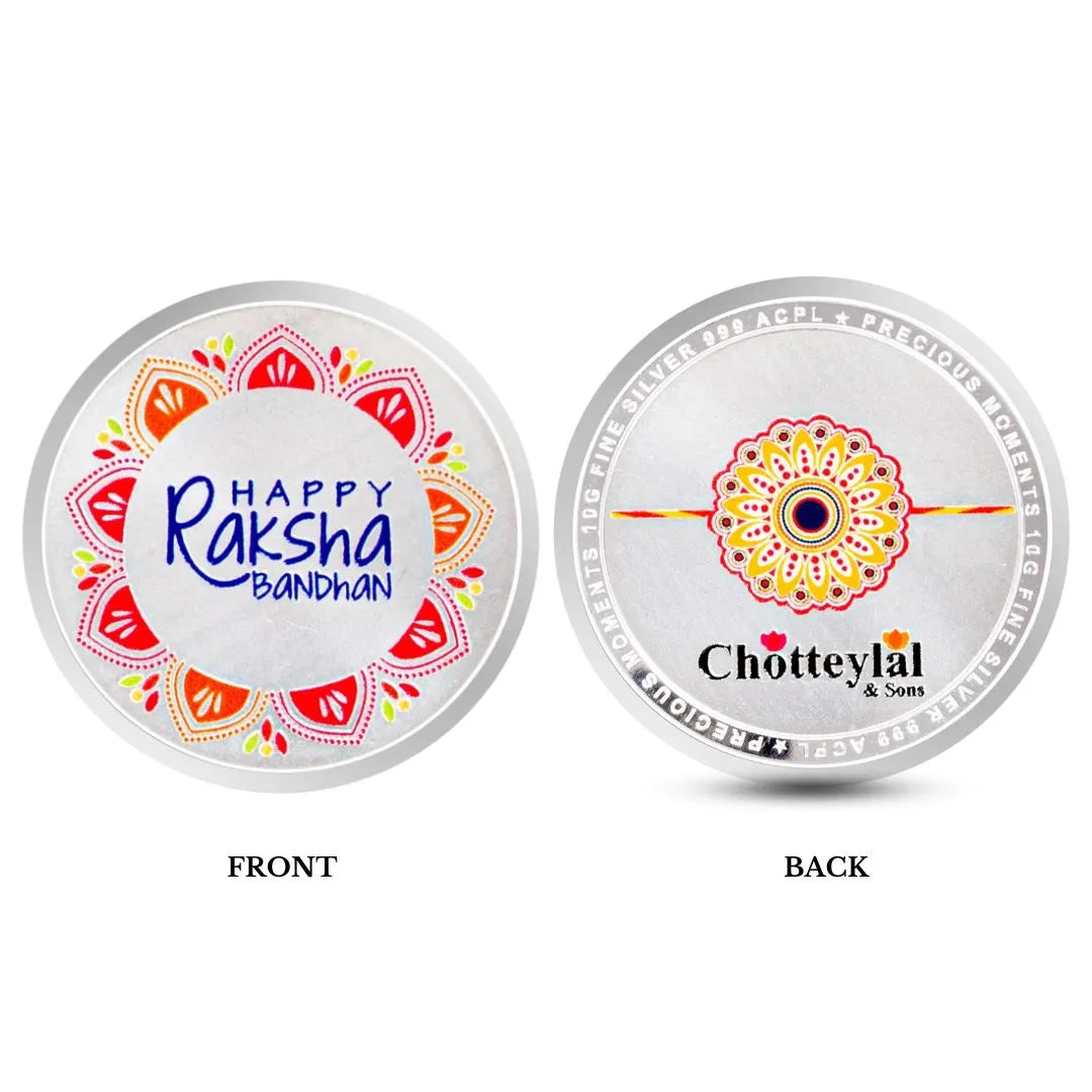 This Raksha Bandhan, give an auspicious blessing with Chotteylal and Sons' Pure 999 Silver ACPL Rakhi Coin. This 10-gram coin is the perfect symbol of love and protection. It features a beautiful rangoli design with "Happy Raksha Bandhan" on one side and an intricate design symbolizing the bond between siblings on the other. Celebrate this special festival with a gift that embodies purity and heartfelt sentiments.
