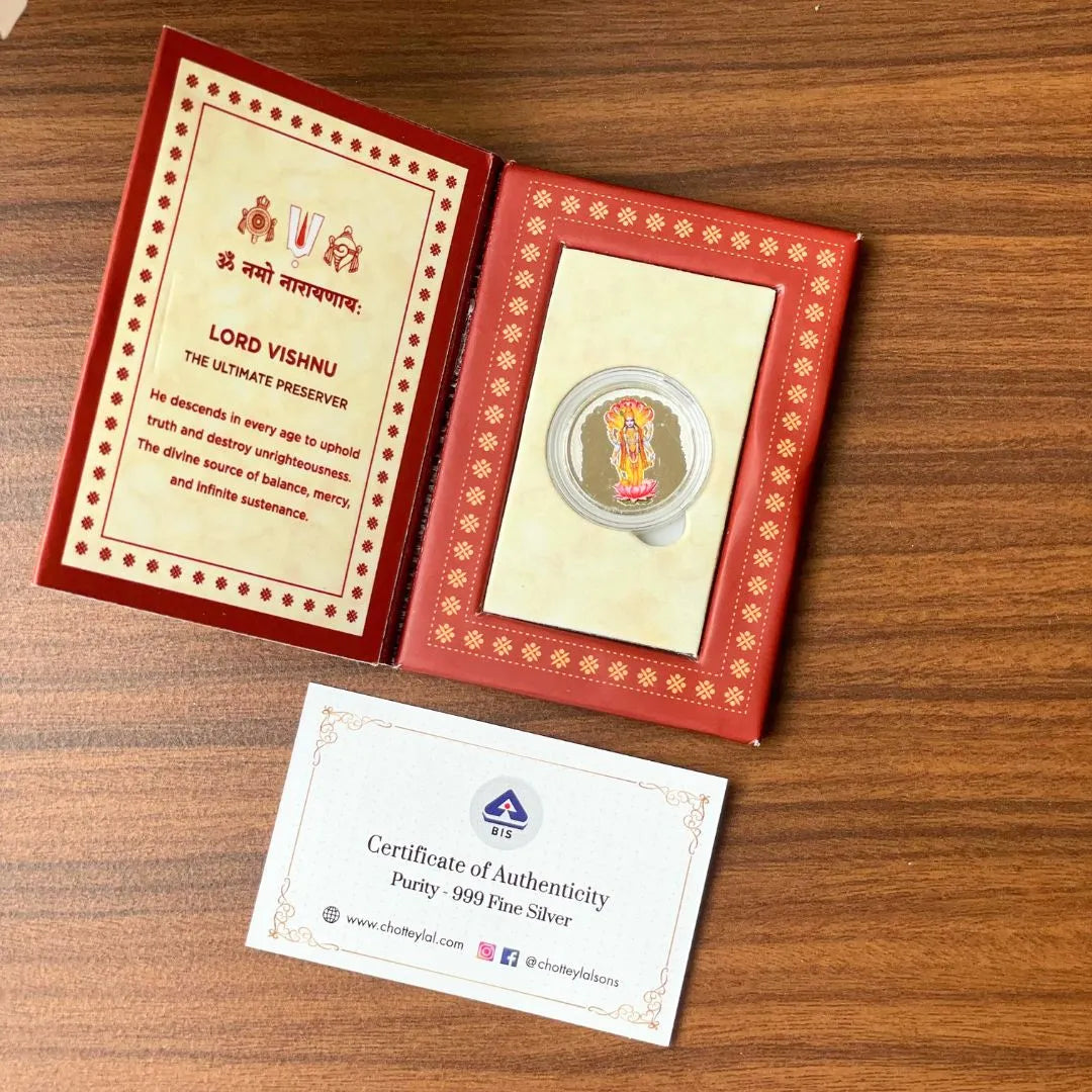 • INDIA’S #1 CHOICE FOR PREMIUM SILVER COIN GIFTING From elegant packaging to impeccable finish, this Vishnu Ji coin reflects the hallmark of craftsmanship that Chotteylal & Sons is renowned for. Whether it's a traditional puja or a modern housewarming, this coin fits every sacred occasion beautifully.