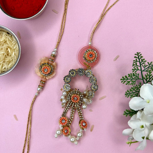 Red Flower & White Beads Bhaiya-Bhabhi Rakhi Set – Elegant Festive Design