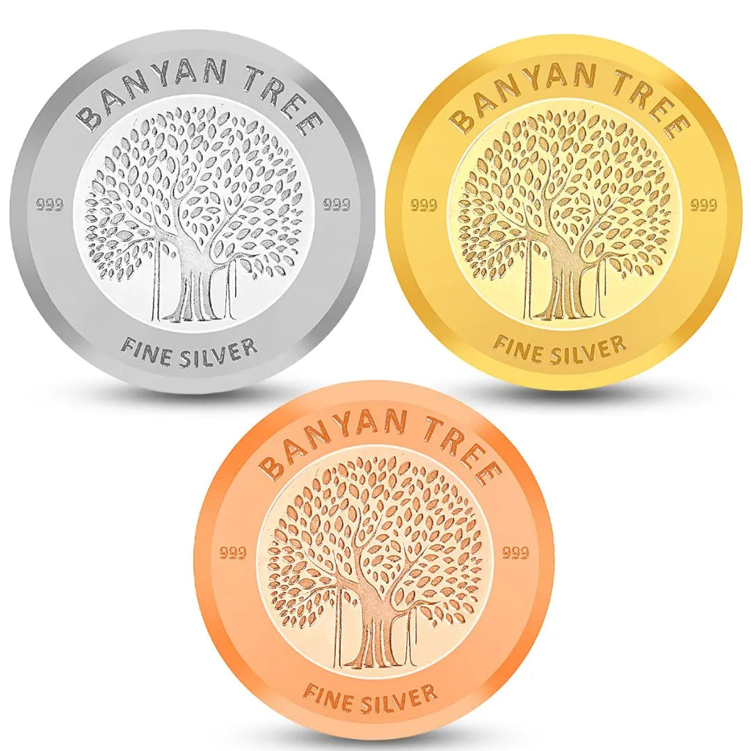 Banyan Tree, Tri-Color, Round Shape, Set of 3 Coins (3 Gram Each), White Box Cover, 999 Purity Silver Coin - Ready To Ship