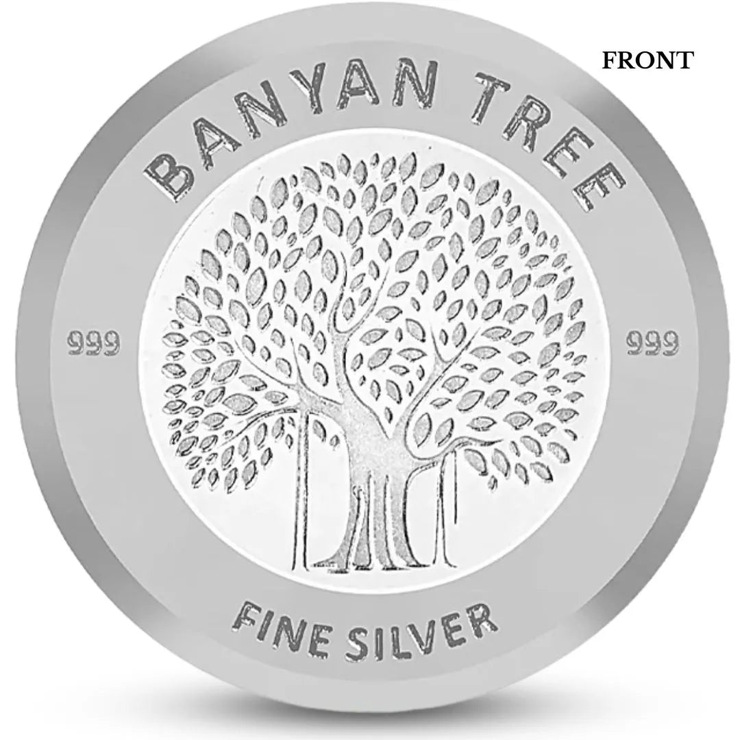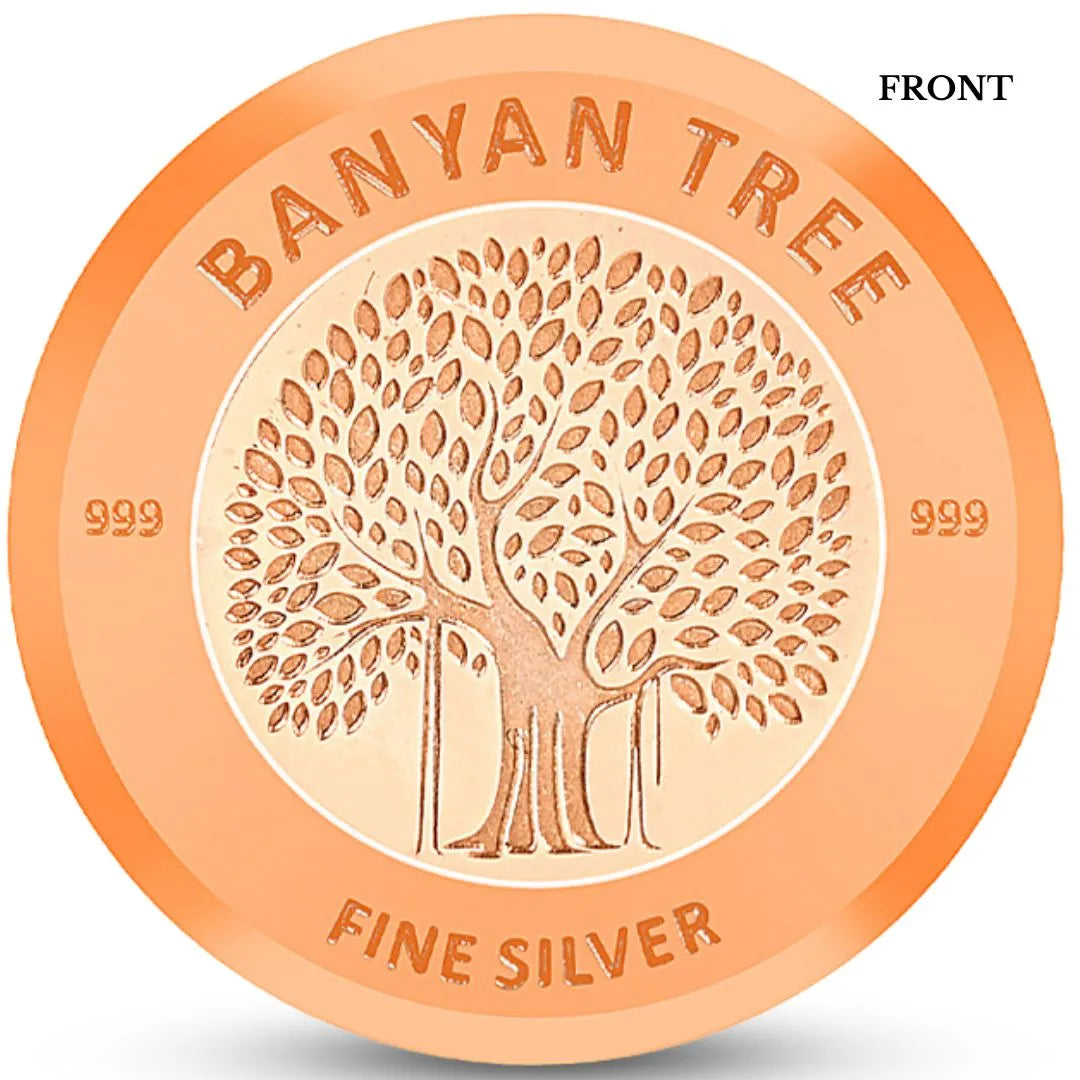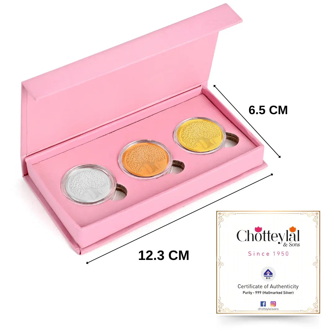 The Banyan Tree Design, Tri-Colour Finish, Round Shape Silver Coin Set by Chotteylal & Sons is more than a collectable. Crafted from 999 purity silver, this set of 3 coins is adorned with a tri-colour finish, representing growth, balance, and blessings. The Banyan Tree, a sacred emblem of strength and prosperity, makes this set a meaningful gift for festivals, weddings, and milestones.