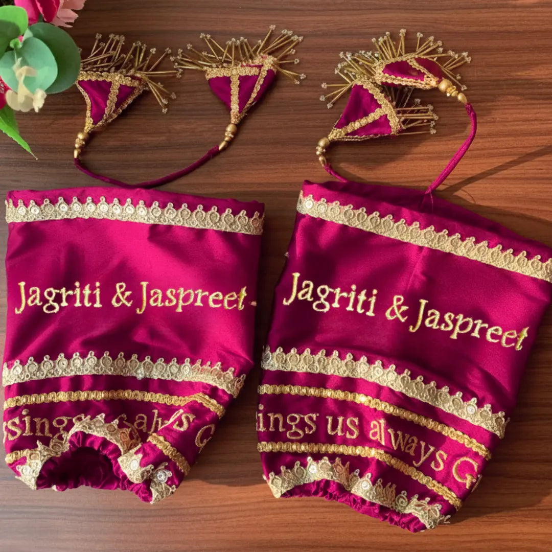 The Blessings Always Guruji Pink Chooda Cover is made for brides who love soft, elegant colours paired with divine charm. Crafted with exceptional quality, this cover brings a touch of serenity and beauty to your ceremony. The gentle pink colour adds freshness and feminine grace to your bridal preparations, making it a perfect match for modern and pastel-themed weddings. Its smooth satin texture ensures premium comfort while keeping your chooda fully protected. Designed with devotion and care, this product comes from Chotteylal and Sons, a brand known for premium wedding essentials.