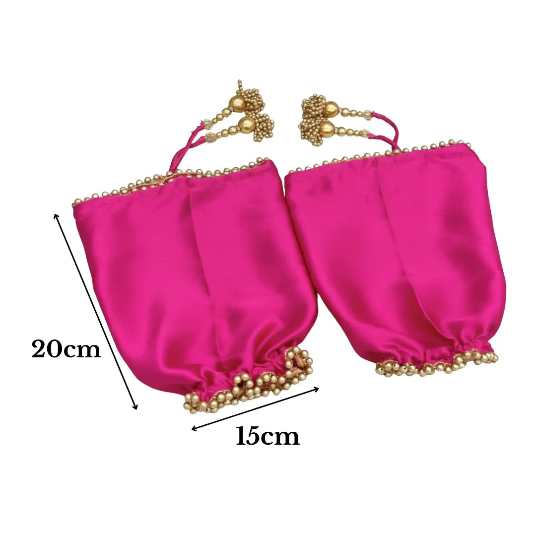 The Parineeti With Pearl Beads Pink Chooda Cover is an elegant and graceful accessory designed to elevate the bridal Chooda ceremony. Crafted from premium velvet, it offers a soft, luxurious texture while protecting your Chooda during rituals. The delicate pearl bead detailing adds a feminine charm and a touch of sophistication. Its soft pink color conveys grace, elegance, and romance, making it an ideal choice for modern brides. Brought to you by Chotteylal and Sons, a brand renowned for decades in providing high-quality wedding essentials, this cover ensures exceptional craftsmanship and premium quality. Perfect for rituals, photography, and ceremonial displays, the Parineeti Pink Chooda Cover not only safeguards your Chooda but also enhances the overall aesthetic, creating a memorable and stylish experience. Its meticulous detailing and soft finish make it a must-have for every bride seeking elegance, tradition, and beauty in one exquisite accessory.