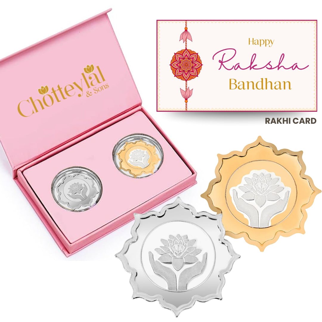 Lotus In Hand Design Silver & Gold Finish Silver Coin Set – 5 Grams Each, 999 Purity, Lotus Shape – Best Wishes Packaging (Set of 2)