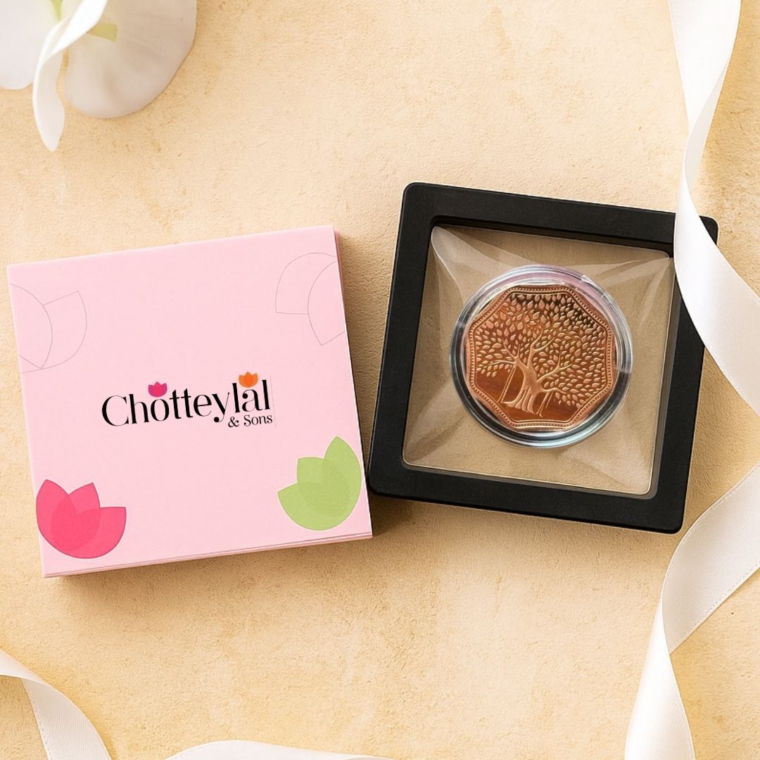 With a legacy since 1950, Chotteylal & Sons ensures unmatched purity, craftsmanship, and elegance. This 5 gm octagon Banyan Tree coin in rose gold finish is a treasured, auspicious, and meaningful gift.