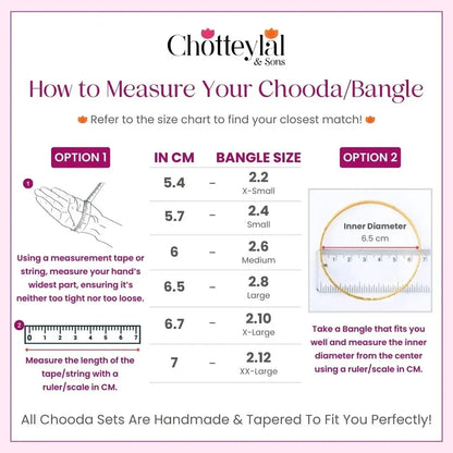 Our Chooda Sets are custom made by experienced artisans to fit your arms perfectly. The sizes start varying from the wrist towards the arms. As the arm size grows from your wrist up, so does our Chooda. Please select your size after carefully following the instructions in our Size Chart.