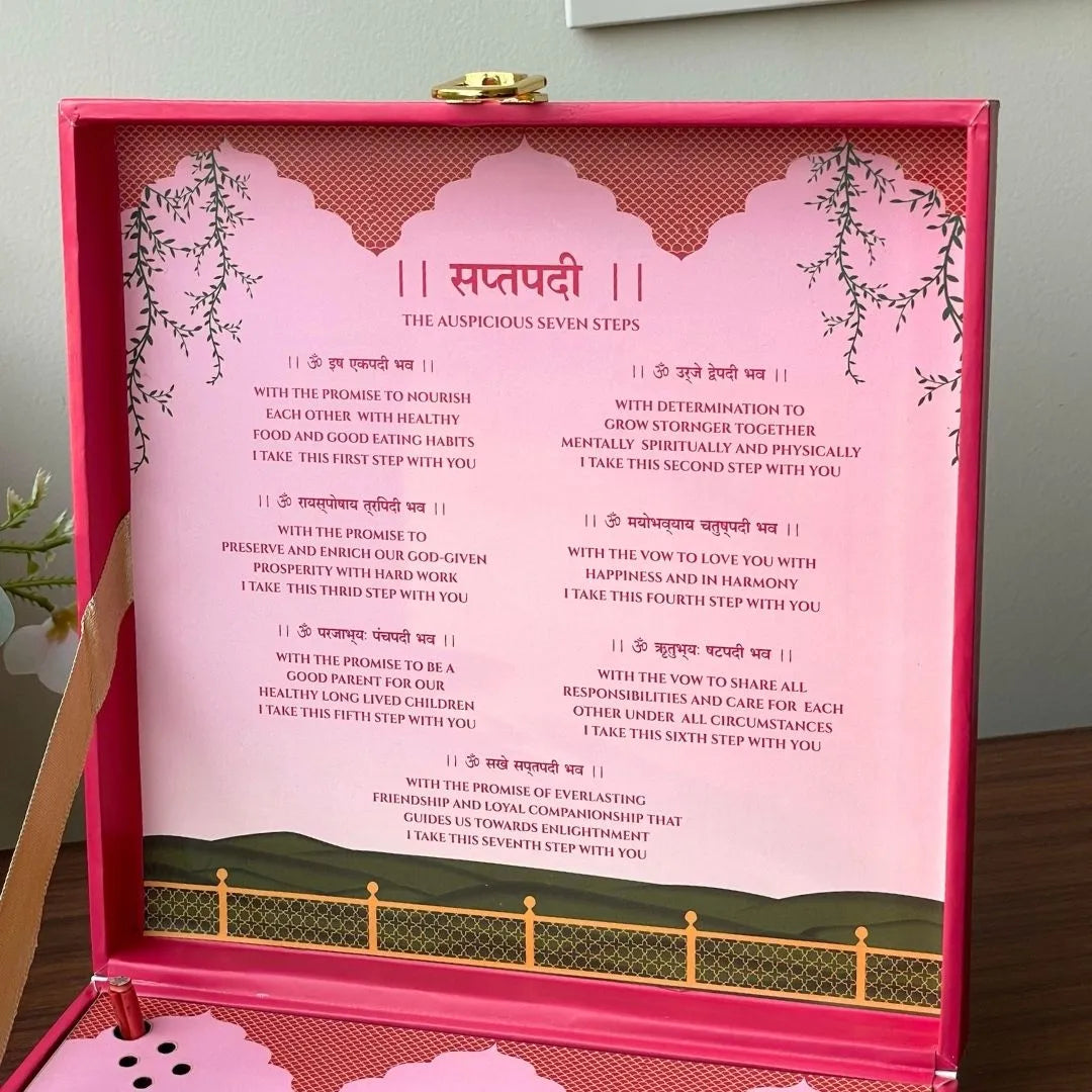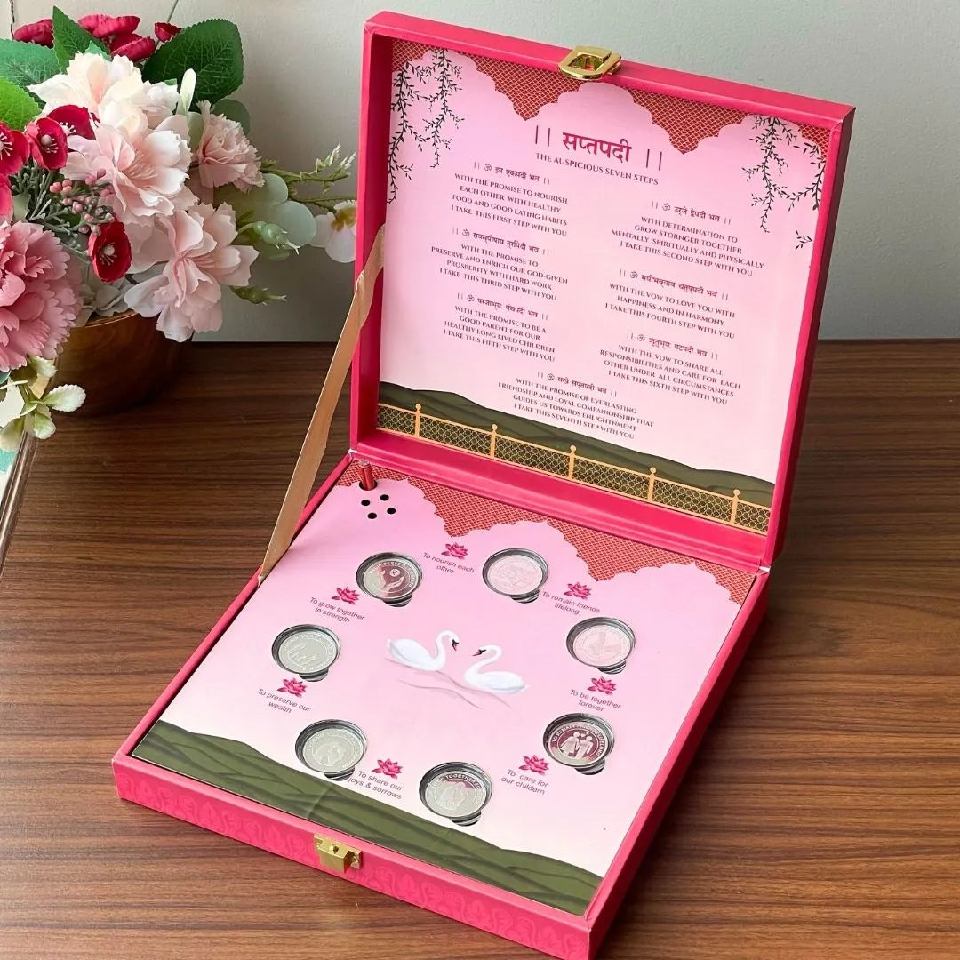 Presenting the Musical 7 Vachan (7 Vows) Cream Wedding Coin Box—a luxurious keepsake that captures the essence of sacred matrimony. This exquisite set includes 7 UV-printed silver coins (3 grams each), crafted from 999 purity silver, beautifully encased in a cream-colored musical box that plays a soothing melody every time it’s opened.