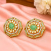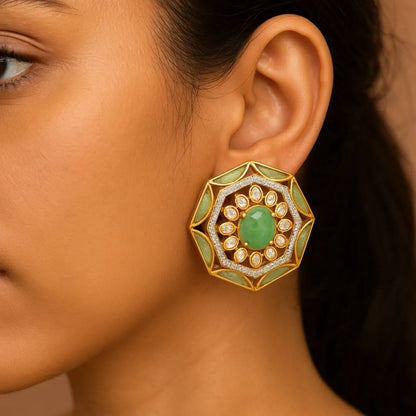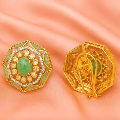 Golden Octagon Polki Earrings with Emerald Gemstone - 22K Gold Plated