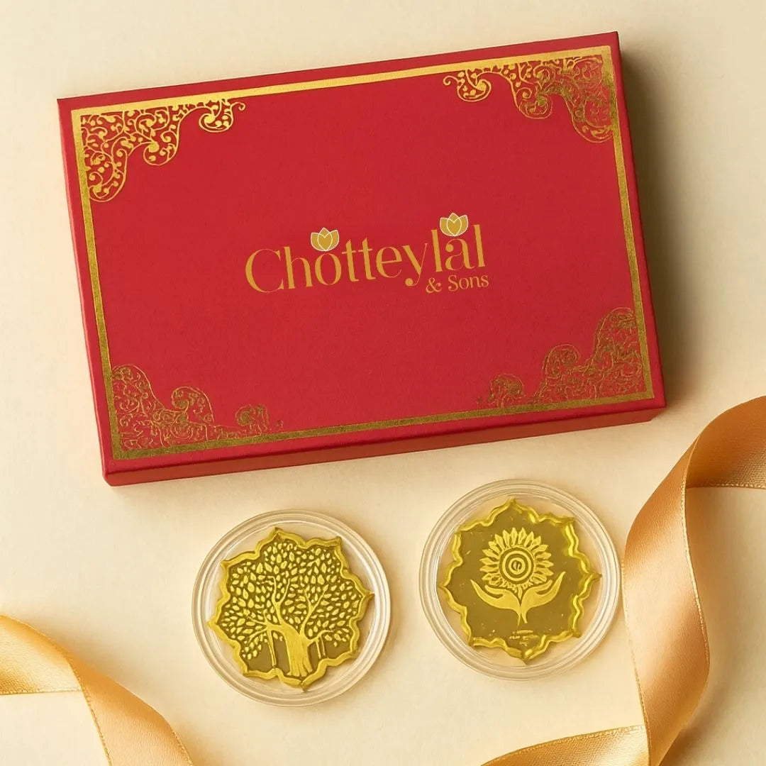 With a legacy since 1950, Chotteylal & Sons combines purity, elegance, and craftsmanship. This 2 x 5 gm Banyan Lotus coin set is an auspicious, meaningful, and timeless silver gift.