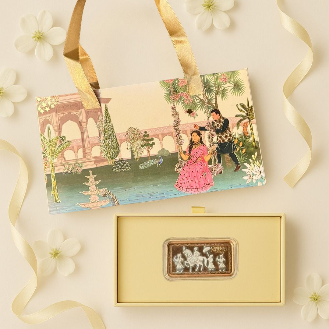 Introducing the Shubh Vivah Baraati Design 20 gm Silver Coin Box Set. This beautifully designed set features a handcrafted Baraati-style silver coin, showcasing the joyful moment where a groom lovingly swings his bride, symbolising happiness, companionship, and everlasting love. Packed in an elegant gift box, this silver coin is not just a present — it is a cherished memory preserved in pure silver.