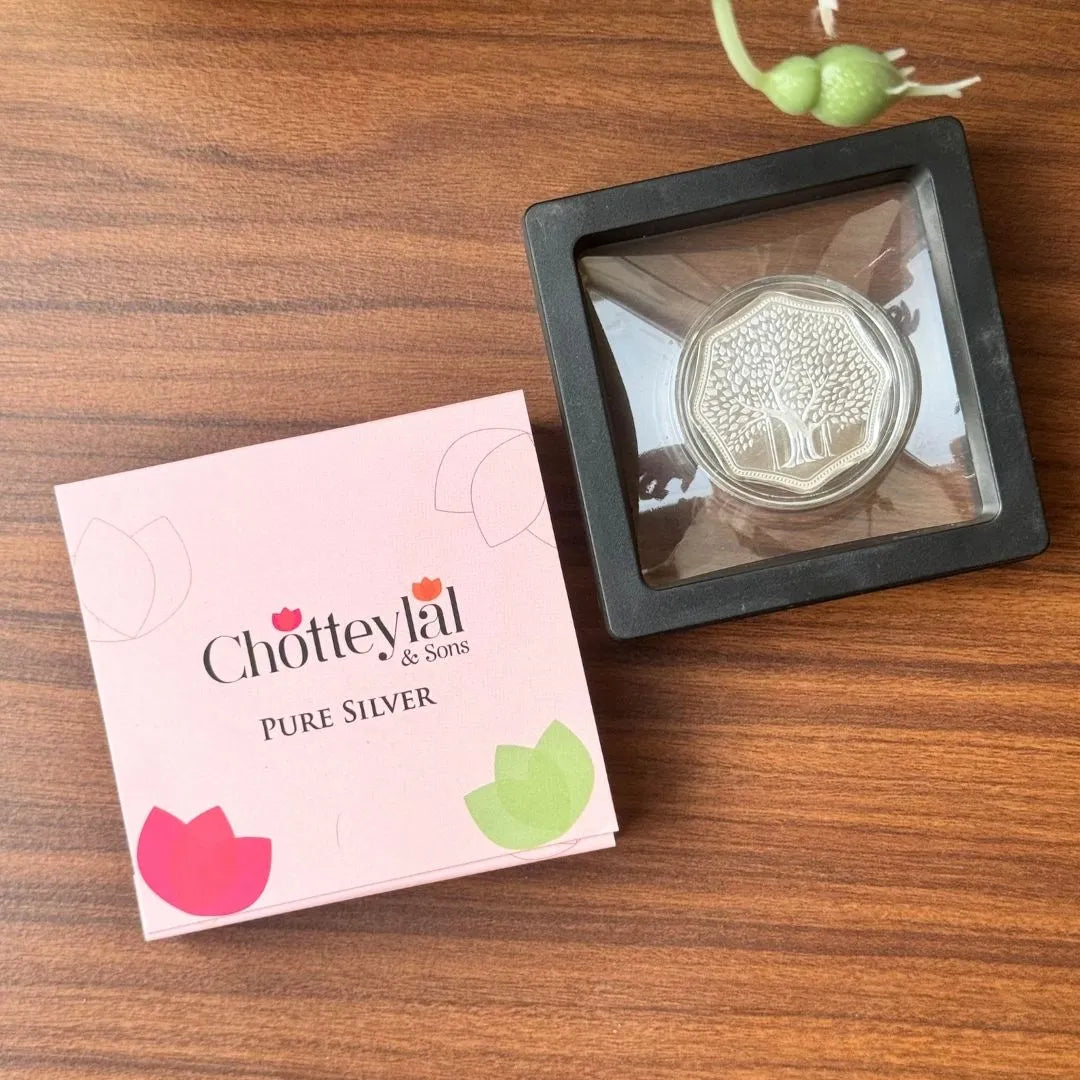 With a legacy since 1950, Chotteylal & Sons combines purity, craftsmanship, and elegance. This 2 gm octagon Banyan Tree coin is a treasured, auspicious, and meaningful silver gift.