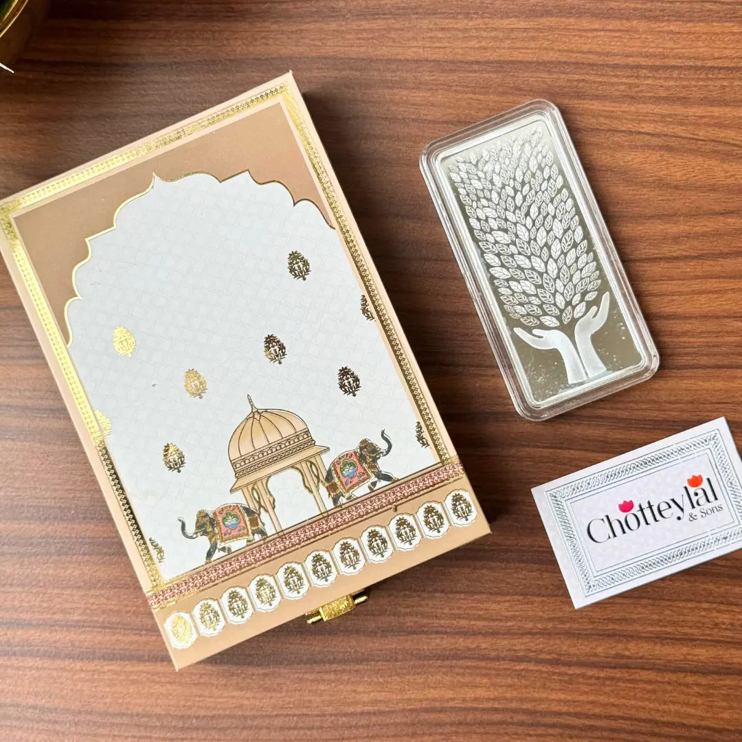 Presenting the 999 Pure Silver Leaf in Hand 100gm Bar Coin, a masterpiece of divine craftsmanship and purity. Crafted with intricate detailing, this bar-shaped silver coin features a beautifully embossed leaf-in-hand design symbolising prosperity, growth, and blessings. With 100 grams of pure silver, it’s a statement of luxury and devotion. Encased in an elegant presentation box, it makes a truly auspicious and meaningful gift for festive occasions, weddings, or corporate events. Backed by the legacy of Chotteylal & Sons since 1950, every piece reflects purity, trust, and timeless artistry in premium silver gifting.