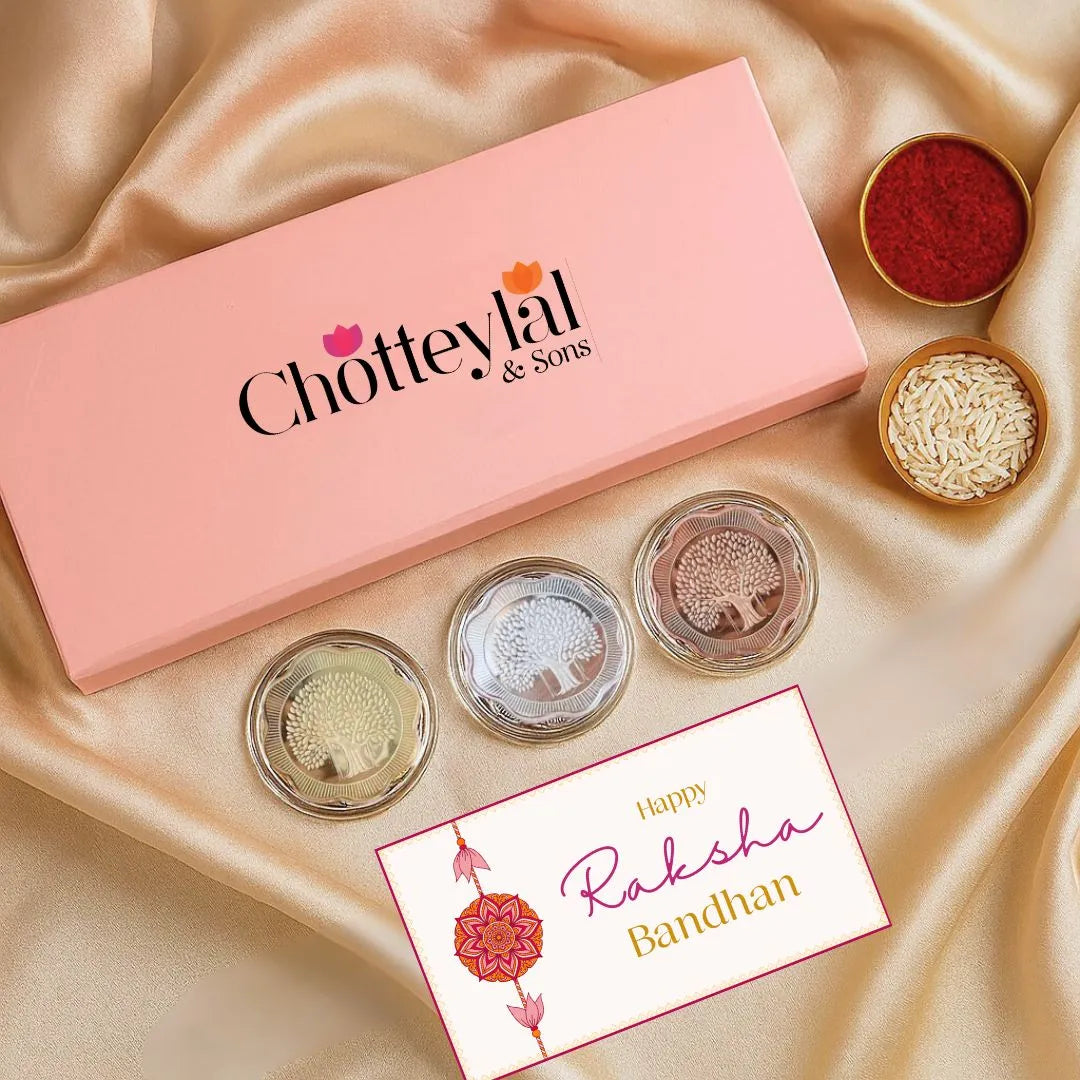Introducing the Banyan Tree, Tri-Color, Floral Shape Silver Coin Set — 3 stunning coins (10 grams each) crafted in 999 purity silver, elegantly packed in a luxury Raksha Bandhan gift box with a beautiful Rakhi greeting card. This isn’t just a silver coin set — it’s a heartfelt tribute to the deep, growing, and unbreakable bond between siblings.