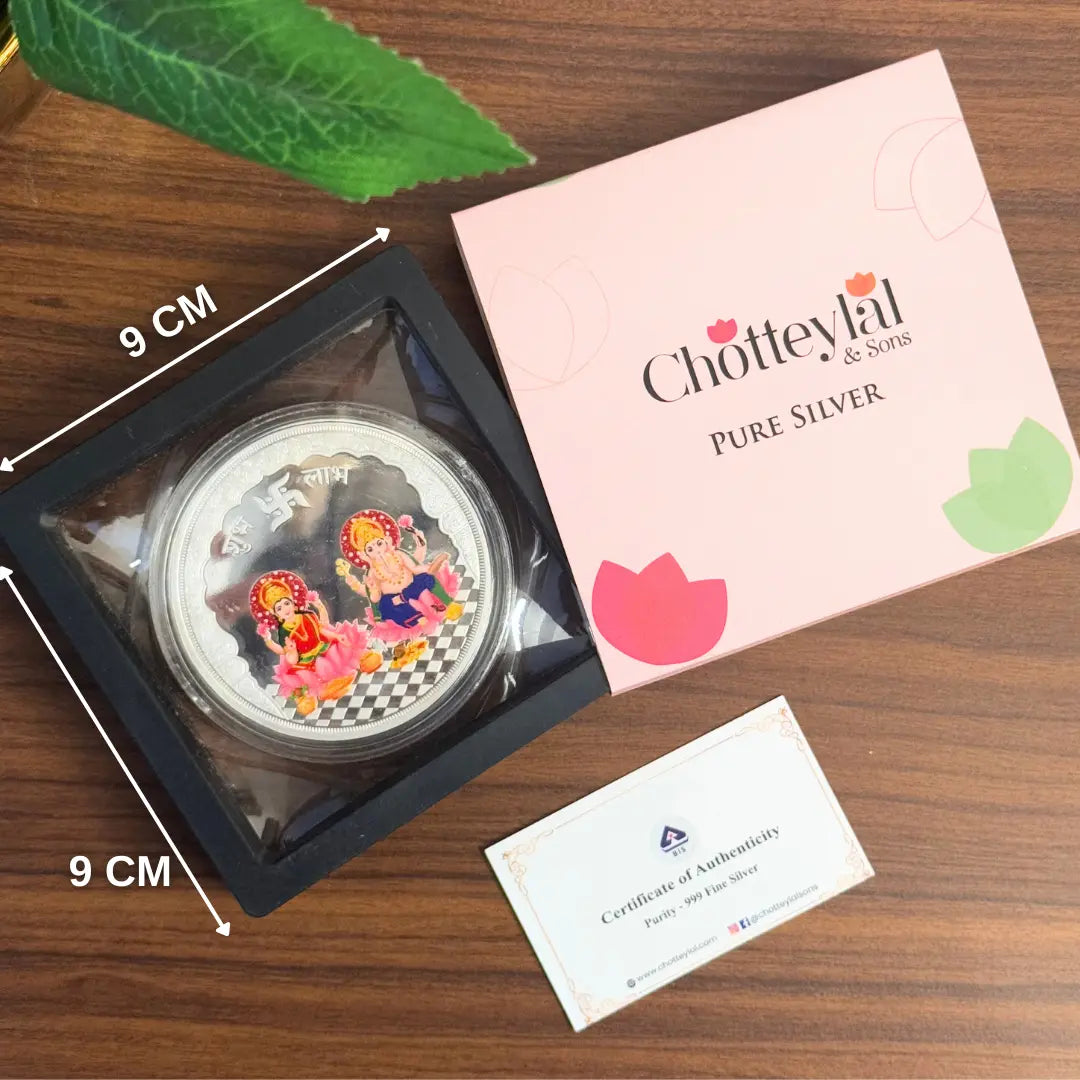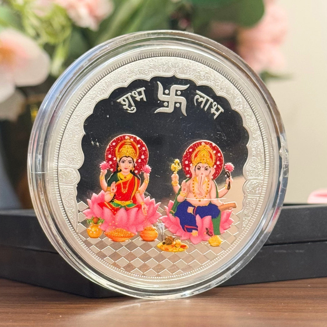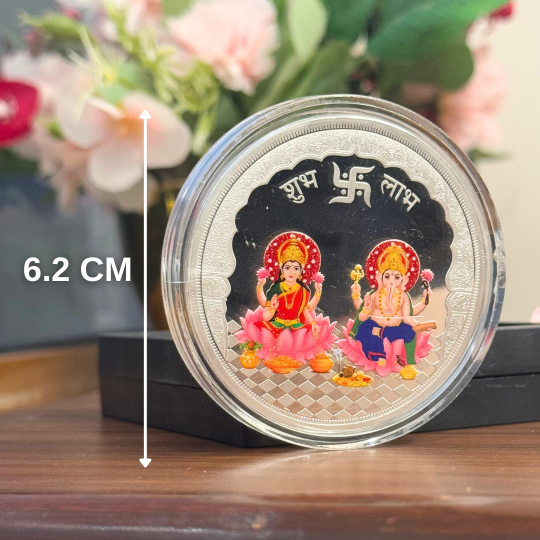 • ELEGANT AND CLASSY DESIGN The UV-printed artwork of Lakshmi and Ganesh Ji adds a colorful, divine touch, turning a silver coin into a visual masterpiece.