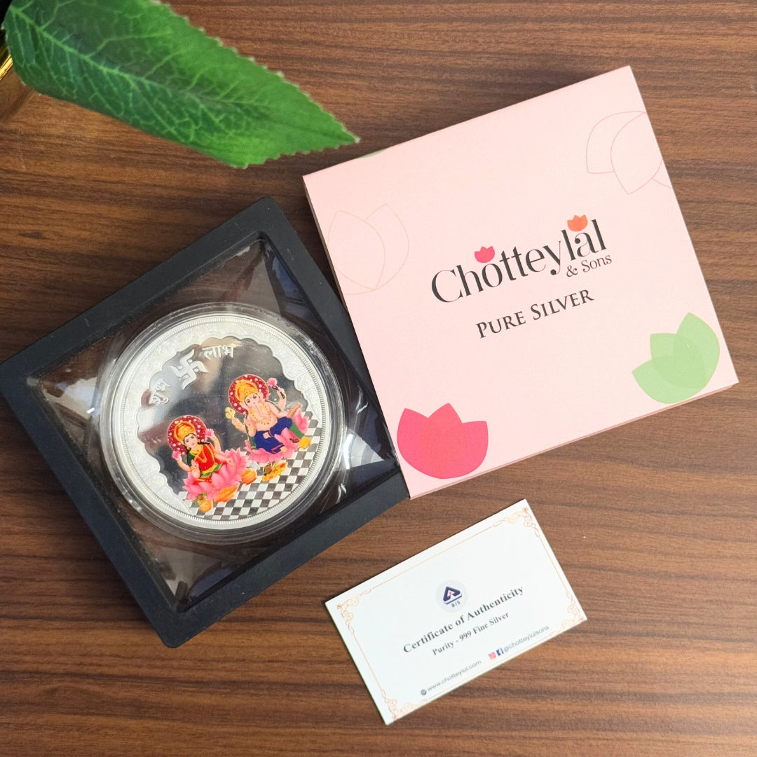 The Lakshmi Ganesh Ji UV Printed Silver Coin is crafted to bring divinity and prosperity into every moment, making your gifts unforgettable.