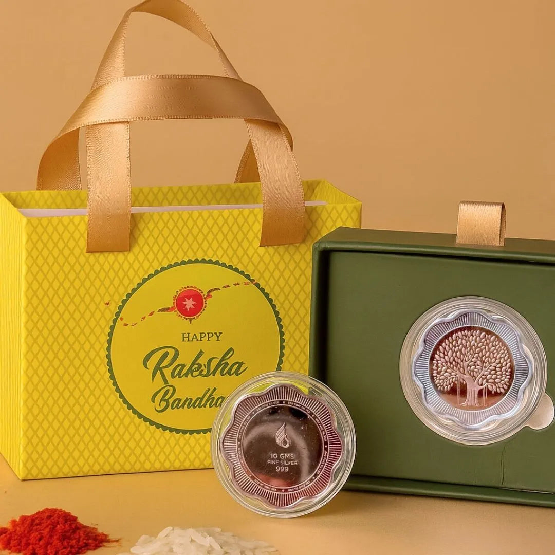 This Raksha Bandhan, make your sibling’s day unforgettable with a gift that symbolises strength, blessings, and prosperity. The Raksha Bandhan 10 Gram Gift Box features a beautiful 10g Banyan Tree Silver Coin, crafted from 999 purity silver with a luxurious rose gold finish. A perfect blend of tradition and elegance, this premium gift reflects the enduring love and bond of Rakhi while offering lasting value for years to come.