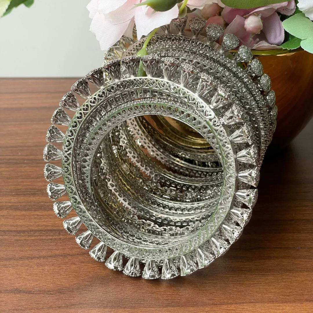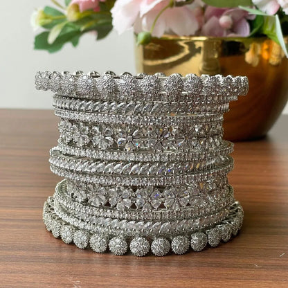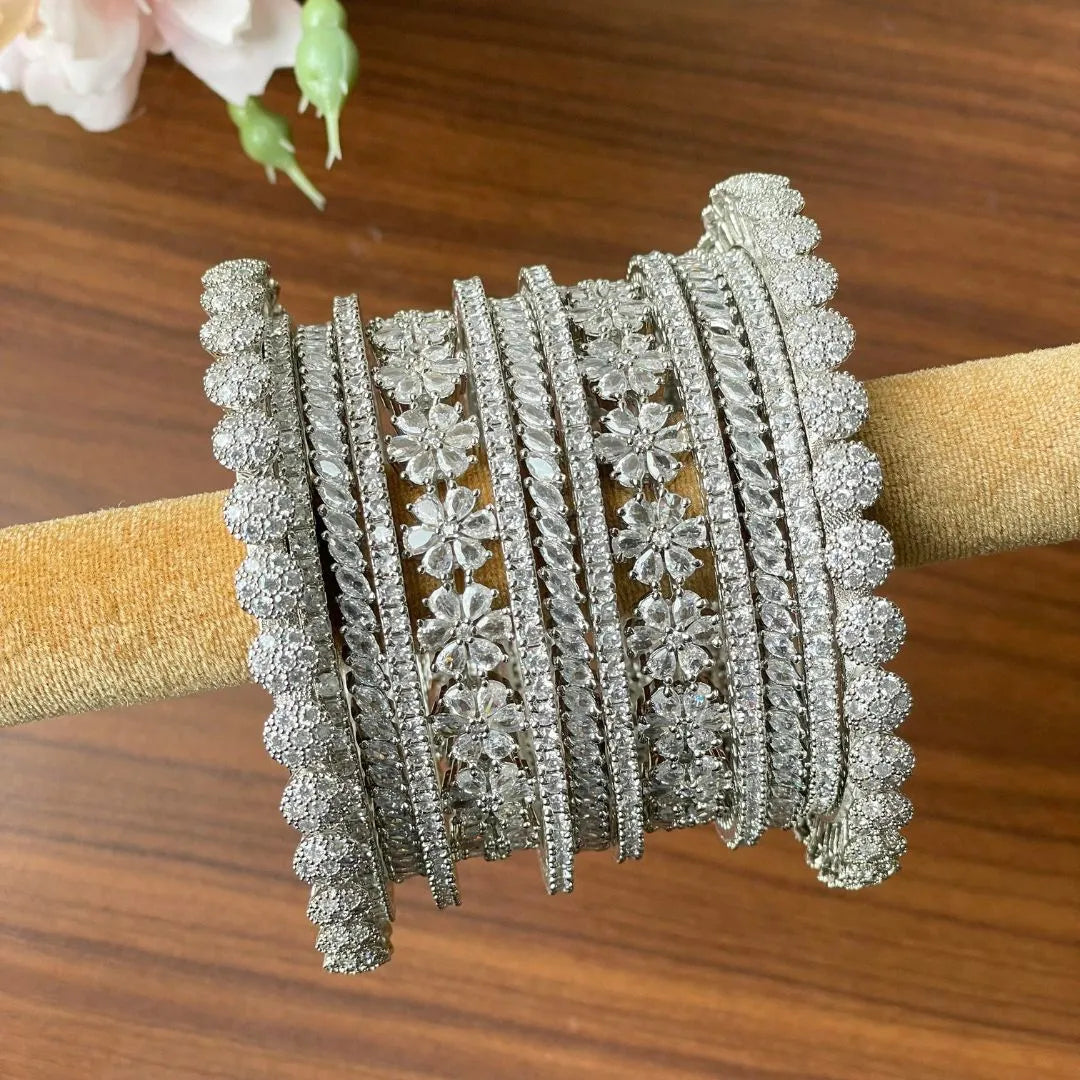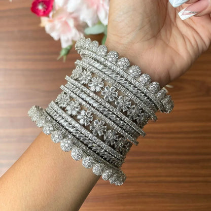 Set Contains: 2 Big Pacheli AD Silver Kada, 6 AD Silver Bangles, 2 Big AD Silver Flower Design, 3 AD Silver Marcus Shape