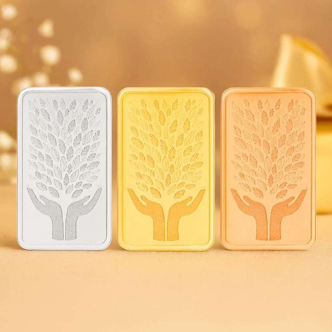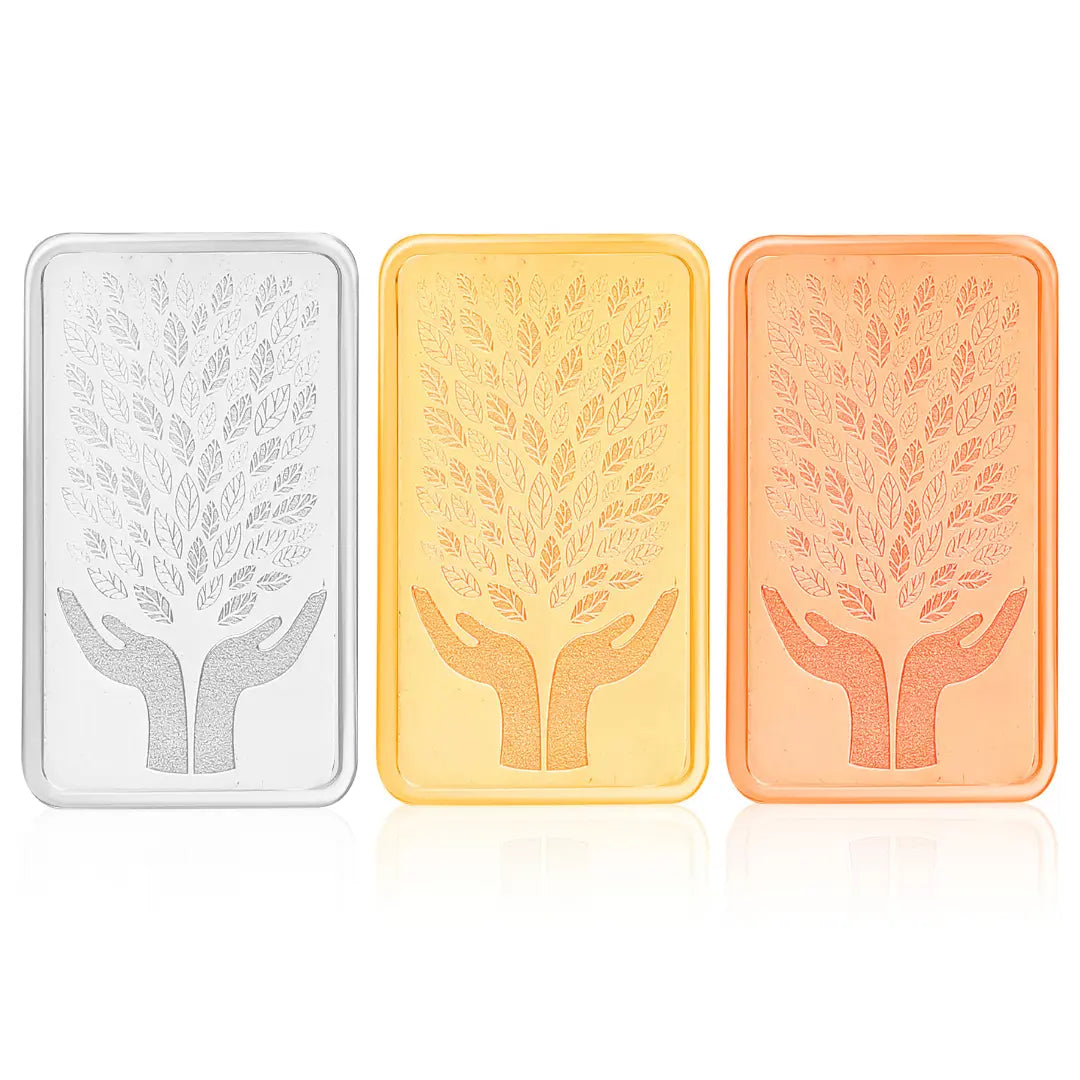 The 999 purity Leaf in Hand 15 gm Tri-Colour Silver Coin (Silver, Gold, Rose Gold) is a true symbol of prosperity, grace, and divine blessings. With its unique tri-colour finish, this coin radiates elegance and auspiciousness, making it an unforgettable keepsake. Packed beautifully in our white, elegant box, it reflects the unmatched quality and legacy of Chotteylal & Sons, trusted since 1950. Whether for gifting or personal purchase, this coin is a perfect blend of tradition and luxury.