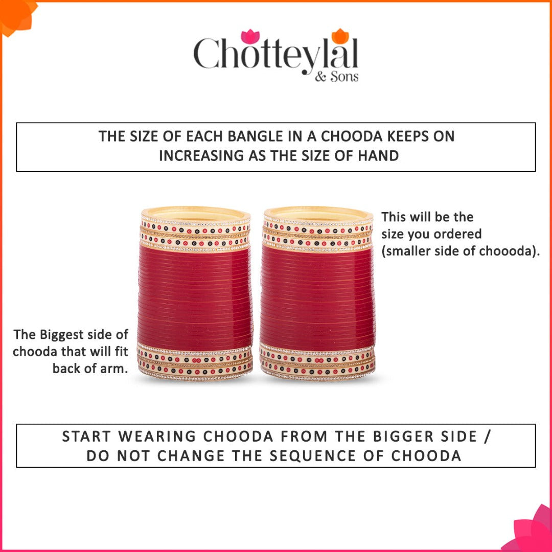 Our Chooda Sets are custom made by experienced artisans to fit your arms perfectly. The sizes start varying from the wrist towards the arms. As the arm size grows from your wrist up, so does our Chooda. Please select your size after carefully following the instructions in our Size Chart.