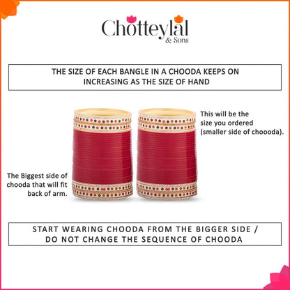 Hey beautiful! Your big day is around the corner. If you still need to shop for your Chuda | Chura | Chooda, don't worry—Chotteylal and Sons have got you covered. With over 70 years of experience in crafting bridal accessories, we offer a red Chura that is truly a work of art. Each piece of our pearl Chuda | Chura | Chooda is meticulously handcrafted to provide a distinctive and flawless appearance. Our Chuda | Chura | Chooda collection is renowned worldwide for its quality its lightweight feel, making it an ideal choice for brides to be. The Semi-Pure Pearl Chuda | Chura | Chooda has been an option since 1950. It continues to be a popular pick for all brides. This Chura effortlessly combines charm with sophistication, ensuring that you exude grace and elegance on your special day.