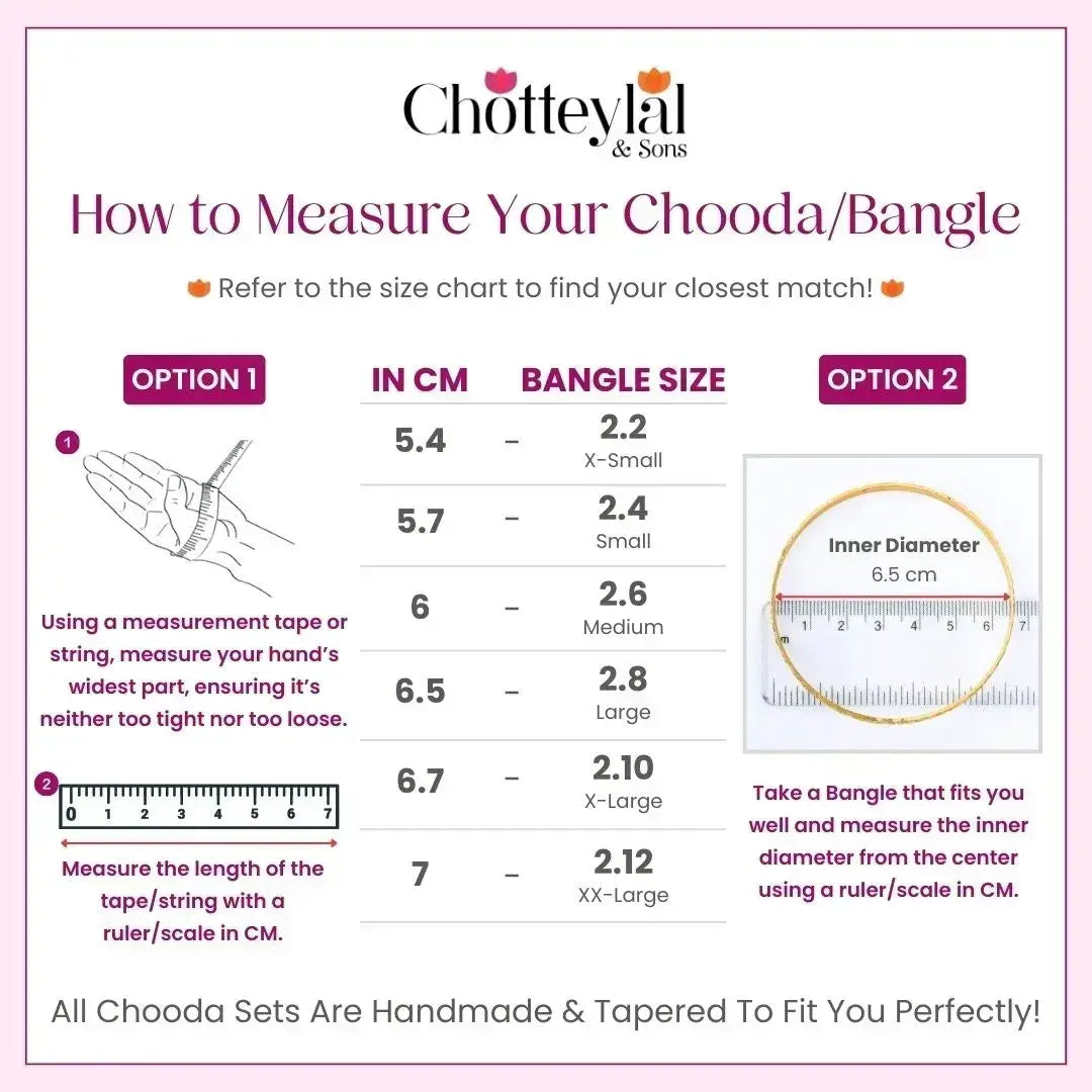 Our Chooda Sets are custom made by experienced artisans to fit your arms perfectly. The sizes start varying from the wrist towards the arms. As the arm size grows from your wrist up, so does our Chooda. Please select your size after carefully following the instructions in our Size Chart.