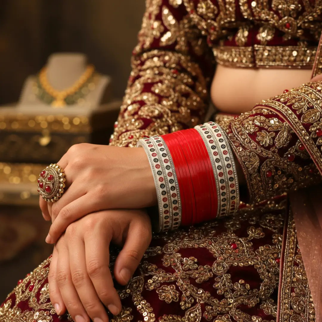 Regular maintenance ensures the lasting beauty of your Chooda. If the bangles accumulate dirt, gently wipe them with a clean, damp cloth to remove any buildup.