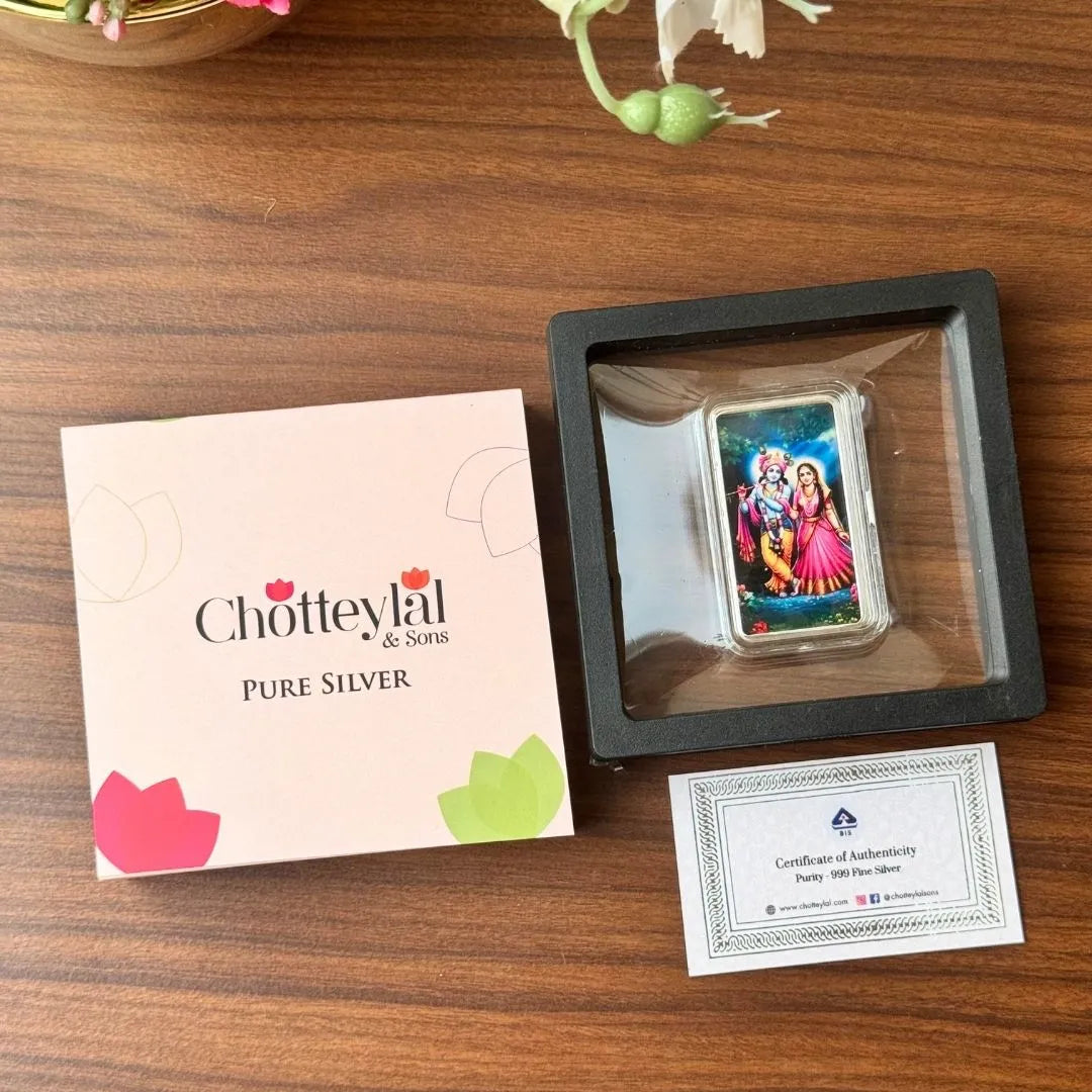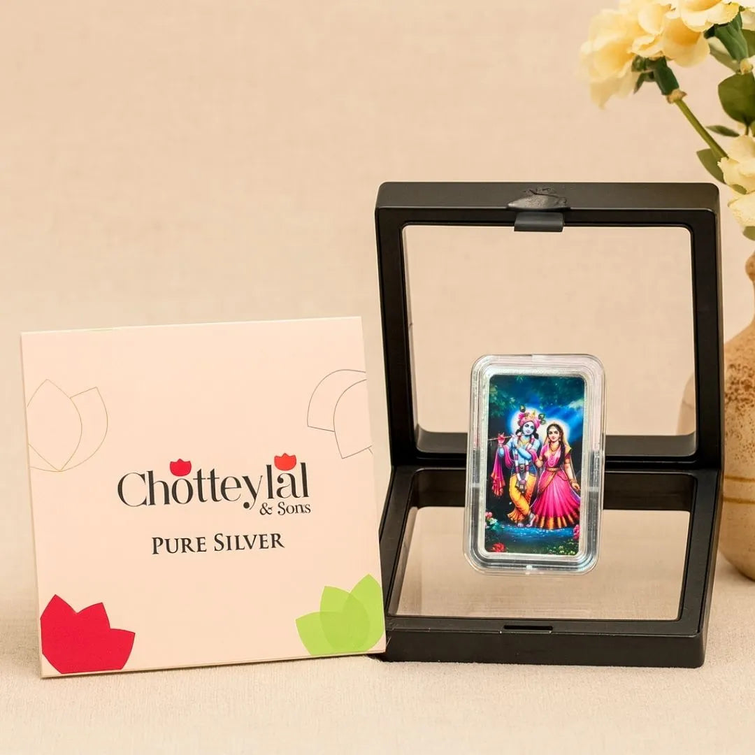 With a legacy since 1950, Chotteylal & Sons combines purity, craftsmanship, and elegance. This 10 gm Radha Krishna bar-shaped UV print coin is a treasured, auspicious, and meaningful gift.