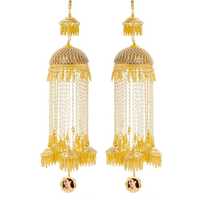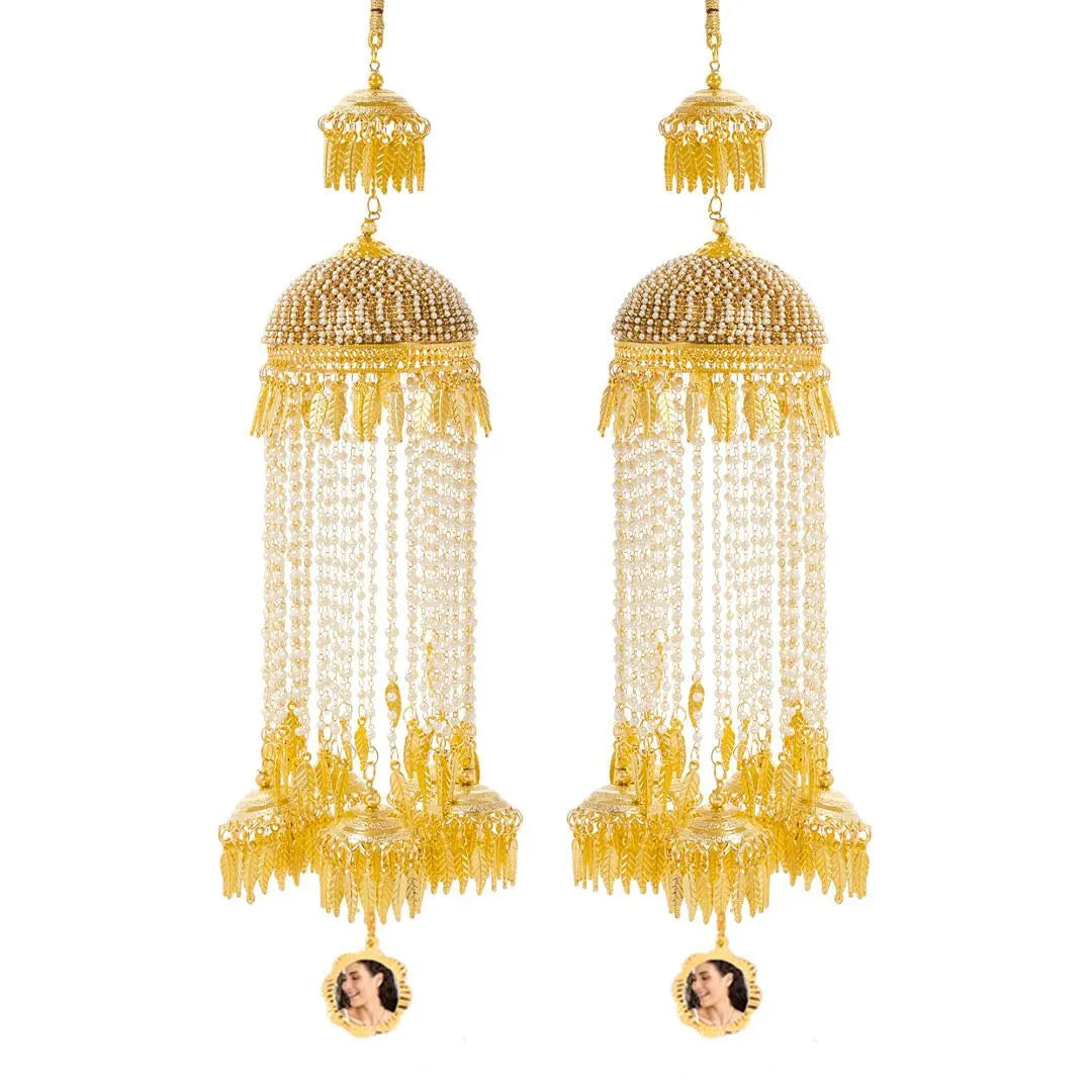- Elegant Craftsmanship: Designed with an ornate dome accented by pearls and stones, this golden-look piece shines with regal elegance. Pearl strings, tiny domes, and golden leaves add charm to every detail. Personalize it your way and turn your bridal dreams into a stunning reality